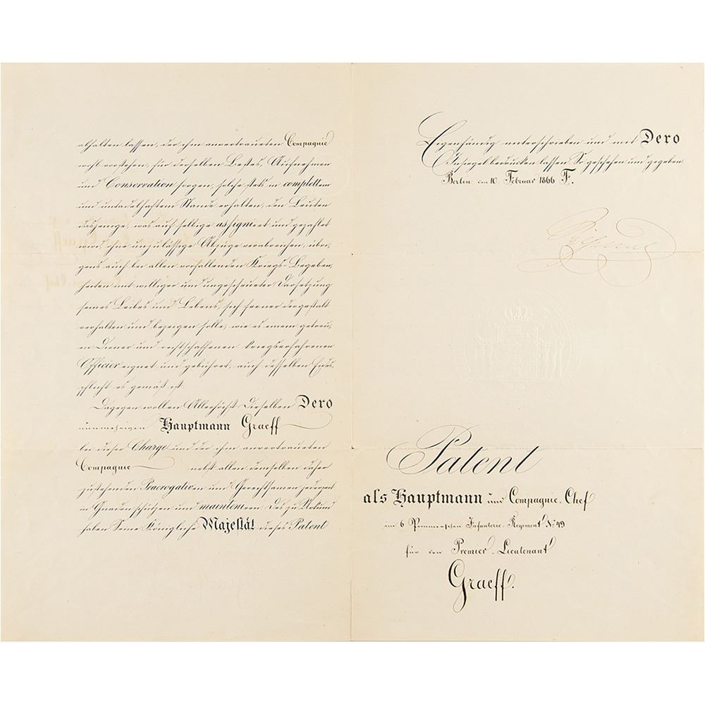 Partly-printed DS in German, signed “Wilhelm,†three pages on two adjoining sheets, 8.75 x 14.25, February 10, 1866. Untranslated patent promoting Premier Lieutenant Carl Graeff to Hauptmann and Compagnie Chef of the 6. Pommerschen Infanterie-Regiment No. 49. Neatly signed at the conclusion in ink by Kaiser Wilhelm I. In very good to fine condition, with light creasing, and splitting to the ends of the folds. Accompanied by three related, unsigned patents from 1852, 1853, and 1860, also promotions for Carl Graeff.