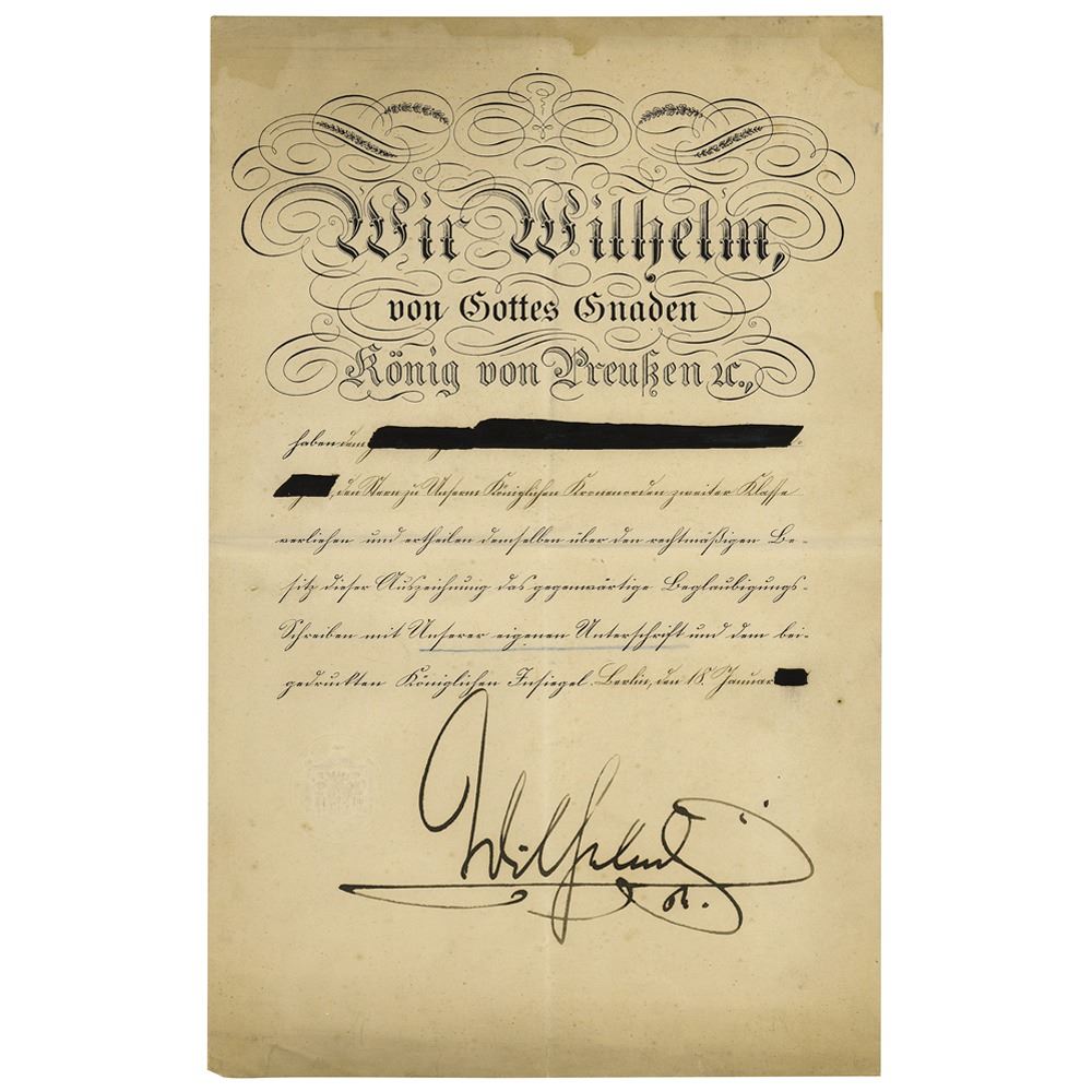 Manuscript DS in German, signed “Wilhelm R,” one page, 8.25 x 13, January 18. Untranslated official order issued by Kaiser Wilhelm II, prominently signed at the conclusion in ink. In very good to fine condition, with toning and staining to the top and bottom edges, and a few areas of the text blacked out.