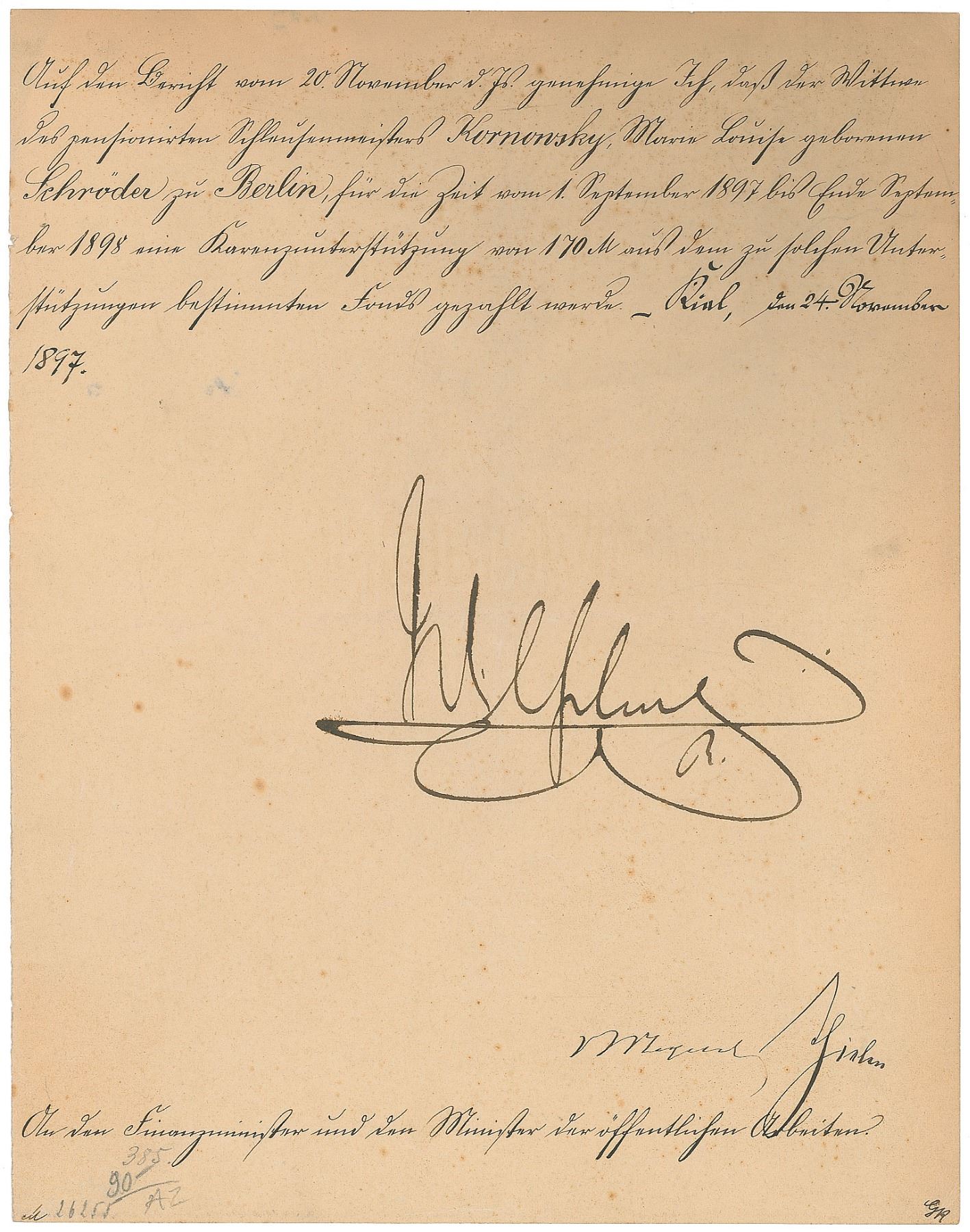 Untranslated manuscript DS in German, signed “Wilhelm R,” one page, 8.25 x 10.5, November 24, 1897. In fine condition, with scattered light foxing.