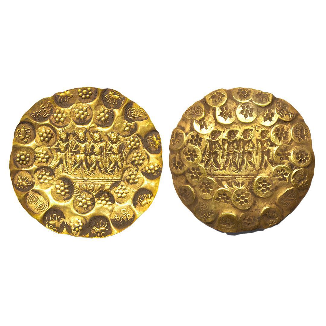 Kakatiyas of Warrangal, Prola-I (1052-1076 CE), Gold PMC, 9.99 gms , 4 -Warrior Type, 2 ½ Gold Gadyana. The broadest known Indian Hindu coin with total of 35 repousse punches on the obverse of a circular flan. Unpublished variety.Extra fine+, Exceedingly rare. The central punch consists of the images of Ram-Laxman-Bharat-Shatrughan in warrior pose. The other punches are struck in two concentric circular orbits. The inner orbit consists of 18 singly struck 8 petalled lotus punches as in a garland. The outer orbit punches consist of 2x Sri-Sri, 1x'Ahitagaja'and 1x'Kesari'in Kannada, and 4 groups of Boar-Lotus-Boar symbols interleaving the legend punches. The above coin is from a small hoard that had a mix of Nolamba, Ganga, and Kakatiya coins. The hoard is believed to be of the mint that changed hands of the Nolambas, Kakatiyas and the Gangas dynasties. 'Ahitagaja Kesari' is one of the common titles of the Kakatiyas adorned by many of the rulers of the dynasty starting from Prola-I. The coin fabric suggests that the coin is of period of transition between the Nolambas and the Kakatiyas. The above coin hence is assigned to Prola-I (1052-1076 CE).