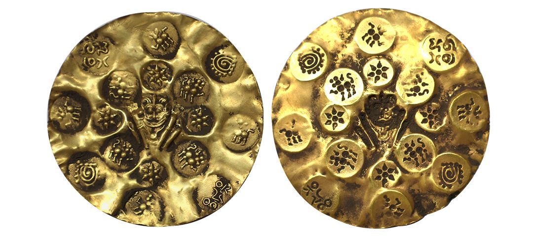 Kakatiyas of Warrangal, Prola I (1052-1076 CE), Gold PMC, One-and-a-Half (1 1/2) Gold Gadyana, Narasimha type, 5.9g. 57x56mm. The obverse consists of 17 repousse punches elegantly struck on a broad thin flan hammered by dies on two concentric orbits. Unpublished variety. Obv: 1x central punch of kneeling Narasimha, facing front. The inner orbit surrounding the central punch consists of 8x six petalled Lotus punches. The outer peripheral punches consist of 8 punches: 2x Sri-Sri, 1x 'Raaya gaja', 1x ' Kesari' punches inscribed in Kannada, and 4x nine petalled Lotus symbol punches alternating between the legend punches. Extremely fine, Uncleaned, Very rare.