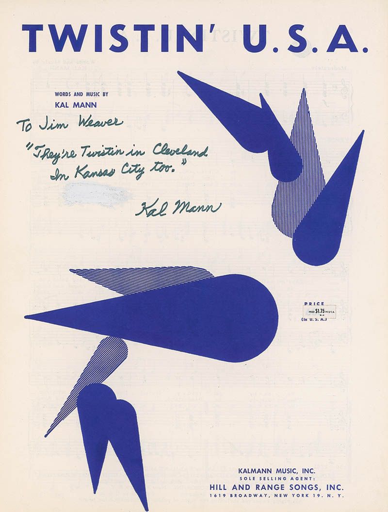 American lyricist (1917–2001) behind such hits as Elvis Presley’s ‘Teddy Bear,’ The Dovells’ ‘Bristol Stomp,’ Chubby Checker’s ‘Let’s Twist Again,’ and Charlie Gracie’s and Andy Williams’s ‘Butterfly.’ Original 1960 issue sheet music to Danny and the Juniors’ ‘Twistin’ U.S.A.,’ signed and inscribed on the front cover in black felt tip with song lyrics, “To Jim Weaver, ‘They’re twistin in Cleveland, in Kansas City too.’ Kal Mann.” An area of white-out below the inscription and a price tag affixed to the cover, otherwise fine condition.