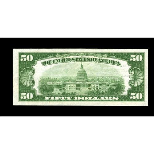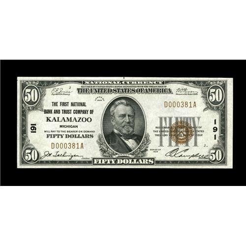 <B>Kalamazoo, MI</B></I> - $50 1929 Ty. 1 <B>The First NB & TC</B></I> Ch. # 191<BR>A lovely note which is one of just a literal handful of uncirculated high denomination pieces from this well collected location. It's crackling fresh, fully embossed and very nicely centered, and would easily merit the full Gem grade but for a tiny sheet bend in the top margin, which compels us to label this example <B>Choice Crisp Uncirculated.</B></I>