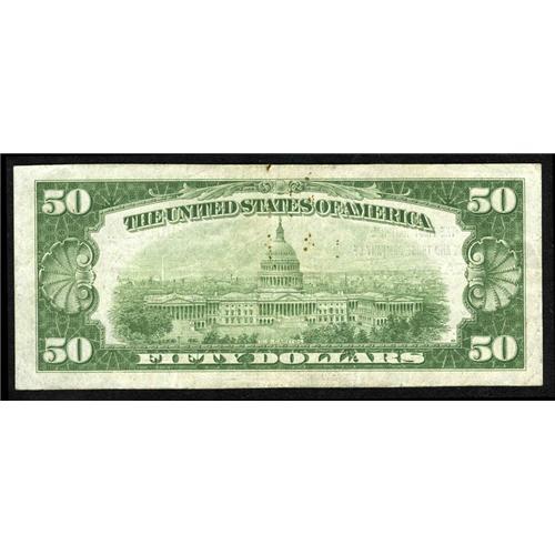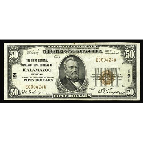<B>Kalamazoo, MI</B></I> - $50 1929 Ty. 1 <B>The First NB & TC</B></I> Ch. # 191<BR>This otherwise <B>Very Fine-Extremely Fine</B></I> note does display some scattered rust stains and a tiny nick in the upper margin. While four banks were located here, this was the only one to issue this type and denomination. It remains, however, quite crisp and fresh and although not particularly uncommon from this issuer, should sell for at least...