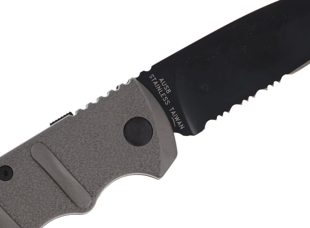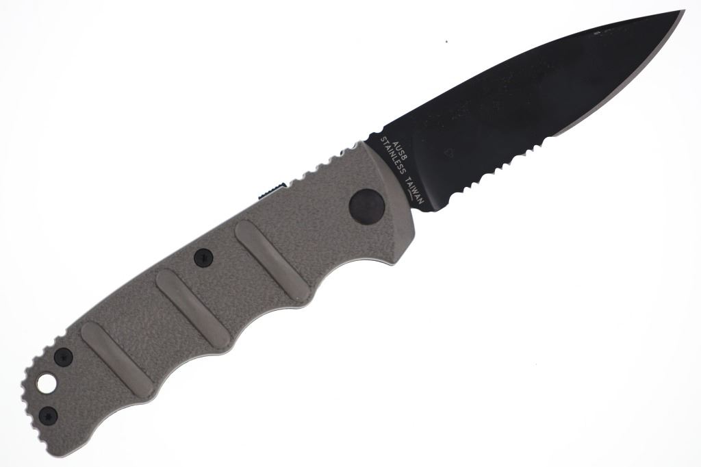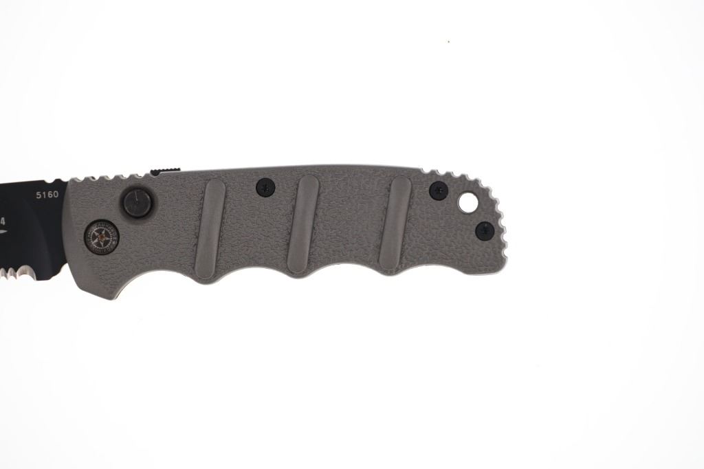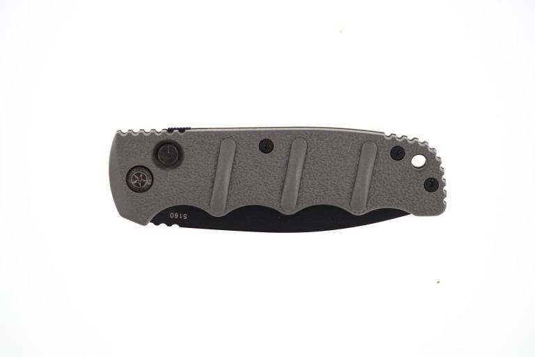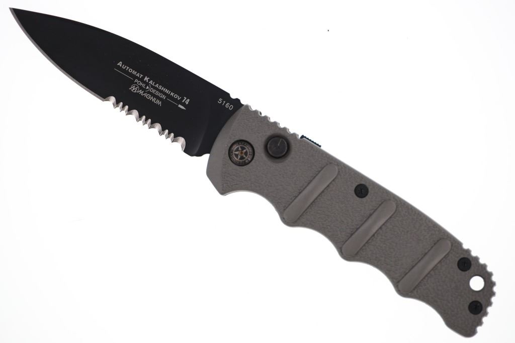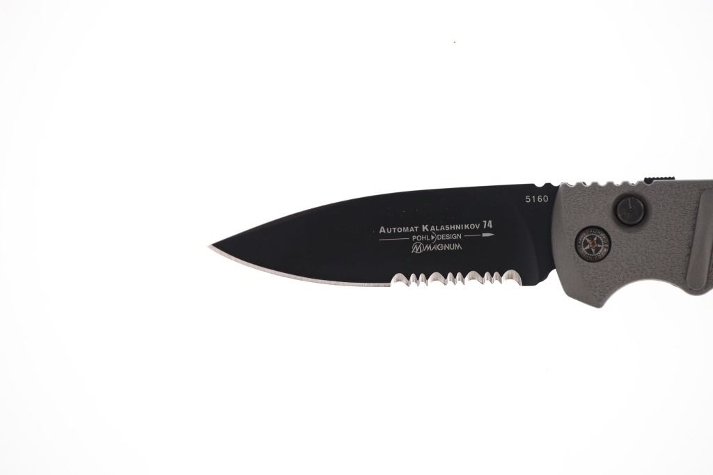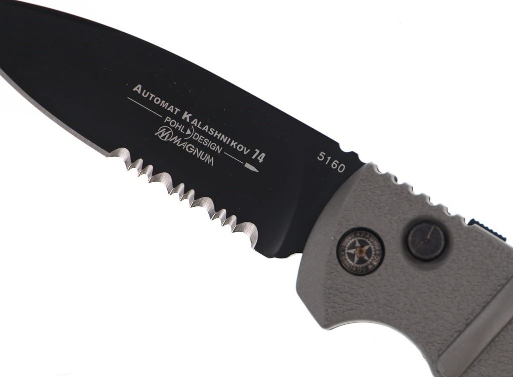 For your consideration is this Automat Kalashnikov 74 switchblade button action knife by Boker. It shows a Pohl Design and features a black, partially serrated blade with dual thumbstuds. The gray aluminum handle features three lines on each side and is textured. The blade is marked reading, "Automat Kalashnikov 74 / Pohl Design Magnum / 5160". It shows good condition overall with little wear present and no signs of damage noted. When opened, it measures 7 5/8" long, with the blade measuring 3 1/4" long. When closed, it measures 4 1/4" L x 1 3/8" W. It has a total weight of 96.2 grams.
