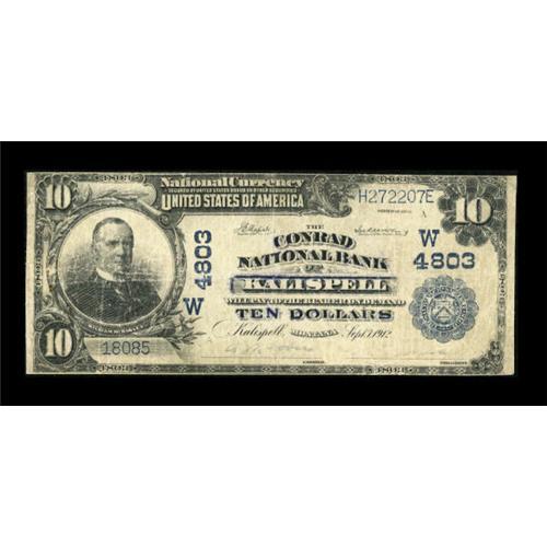 <B>Kalispell, MT</B></I> - $10 1902 Plain Back Fr. 628 <B>The Conrad NB</B></I> Ch. # (W)4803<BR> This piece received a bath at one time and lost some of its printed details. A steady hand was used to redraw some of the details, especially in the title area. Nevertheless, this is a large size Montana. <B>Good.</B></I><BR><I>From The Kansas City Collection.</B></I><BR><BR><b>Shipping:</b> Coins & Currency (<a target="_blank" href="http://www.heritageauctions.com/common/shipping.php">view shipping information</a>)