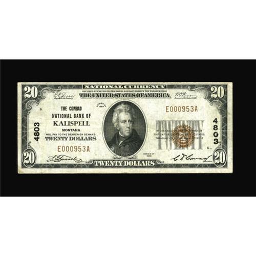 <B>Kalispell, MT</B></I> - $20 1929 Ty. 1 <B>The Conrad NB</B></I> Ch. # 4803<BR> A nice evenly circulated piece from this private name bank which bears the signature of C.J. Conrad as President. <BR><BR><b>Shipping:</b> Coins & Currency (<a target="_blank" href="http://www.heritageauctions.com/common/shipping.php">view shipping information</a>)