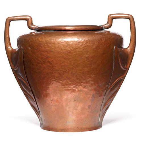 Important Kalo vase, huge broad form in hammered copper with two applied organic handles, original patina, impressed mark, beautifully executed, this is the largest and most important piece of Kalo copper that we have sold, probably executed by Falick No