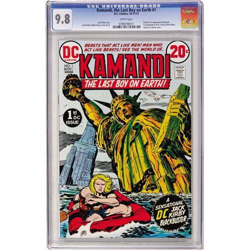 <B>Kamandi, the Last Boy on Earth #1 (DC, 1972) CGC NM/MT 9.8 White pages.</B></I> Origin and first appearance of Kamandi. Jack Kirby story, cover, and art. Overstreet 2006 NM- 9.2 value = $95. CGC census 3/07: 13 in 9.8, none higher.<BR><BR><b>Shipping:</b> Comics - Slabbed (certified) (<a target="_blank" href="http://www.heritageauctions.com/common/shipping.php">view shipping information</a>)