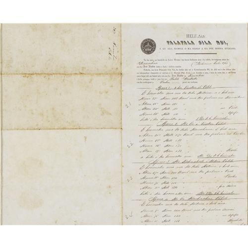 <B>Kamehameha IV and Kaahumanu IV Partly Printed Document Signed</B></I> <I>"Kamehameha"</B></I> as King of Hawaii and <I>"Kaahumanu"</B></I> as Kuhina Nui , two pages, 8" x 13". Honolulu, February 25, 1856. Headed: <I>"Helu 2430/Palapala Sila Nui"</B></I> (Royal Patent Number 2430), this document, entirely in the Hawaiian language, concerns land identified as <I>"Apana 1," "Apana 2," "Apana 3," "Apana 4,"</B></I> and <I>"Apana 5."</B></I> An "apana" is a land parcel. <B>The survey describes the boundaries of five land parcels belonging to a person called Kawaihae situated at Palolo, Waikiki, Oahu, Hawaii,</B></I> and contains a surveyor's sketch of each of the five apana. In 1850, the enactment of the Kuleana Act empowered the Board of Land Commissioners to award title to native tenants for their plots of land or "kuleana" which may consist of several apana. When the Land Commission confirmed an individual's land claim, it issued an award of that land to the claimant. Generally, upon payment of a commutation tax to the government, the Minister of the Interior conveyed complete title in the form of a royal patent. Alexander Liholiho (1834-1863) reigned as Kamehameha IV from 1855-1863. He was a grandson of Hawaii's first king, Kamehameha I, and the nephew and successor of Kamehameha III. King Kamehameha IV's sister, Princess Victoria Kamamalu (1838-1866), had served as Kuhina Nui (equivalent of Premier) since 1855. She had taken the name Kaahumanu IV. On November 30, 1863, when Kamehameha IV died at the age of 29 of chronic asthma, she assumed the Hawaiian throne and, on the same day, named her brother Lot Kapuaiwa to succeeded Alexander as King Kamehameha V. A bachelor, he appointed his sister as Heiress-Apparent and crown princess of Hawaii. She was only 27 when she died in 1866. With no direct heirs, Kamehameha V was the last monarch of the House of Kamehameha. The document has three vertical folds and light foxing. The King has boldly signed to the left of a 1.25" diameter red wax seal. His sister has signed beneath the seal. Matted and framed under glass on both sides to an overall size of 22.25" x 18.5", displaying both sides, the document is in fine condition. <B>A remarkable combination of signatures on one document: 22-year-old King Kamehameha IV (died at 29) and his 17-year-old sister and successor as Regent, Kaahumanu IV (died at 27).</B></I><BR><BR><b>Shipping:</b> Framed - with Glass, Medium (<a target="_blank" href="http://www.heritageauctions.com/common/shipping.php">view shipping information</a>)