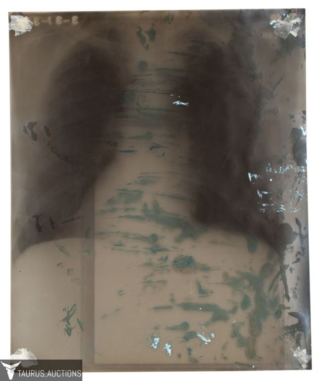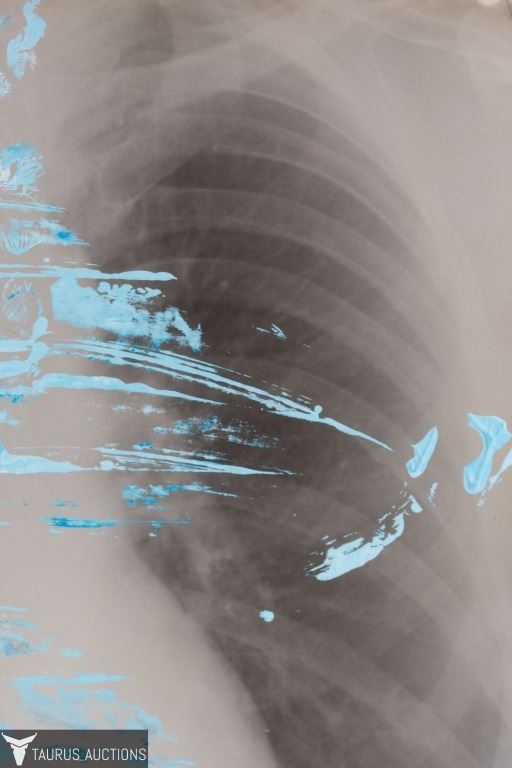 Item/Description: Original abstract composition on an old x-ray. Signed lower center: Kamen. Titled on the mat: Night Stroll.