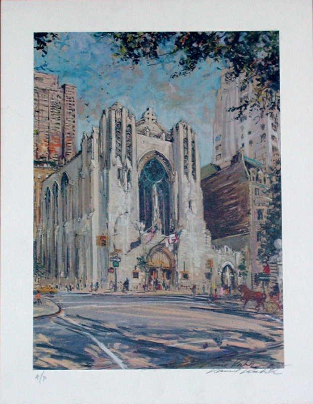 A view of the well known church on the corner of Fifth Avenue and 90st Street in New York. This is a signed in pencil 18x14 in. offset lithograph on gloss paper. Domestic shipping-$20, International depends upon location.