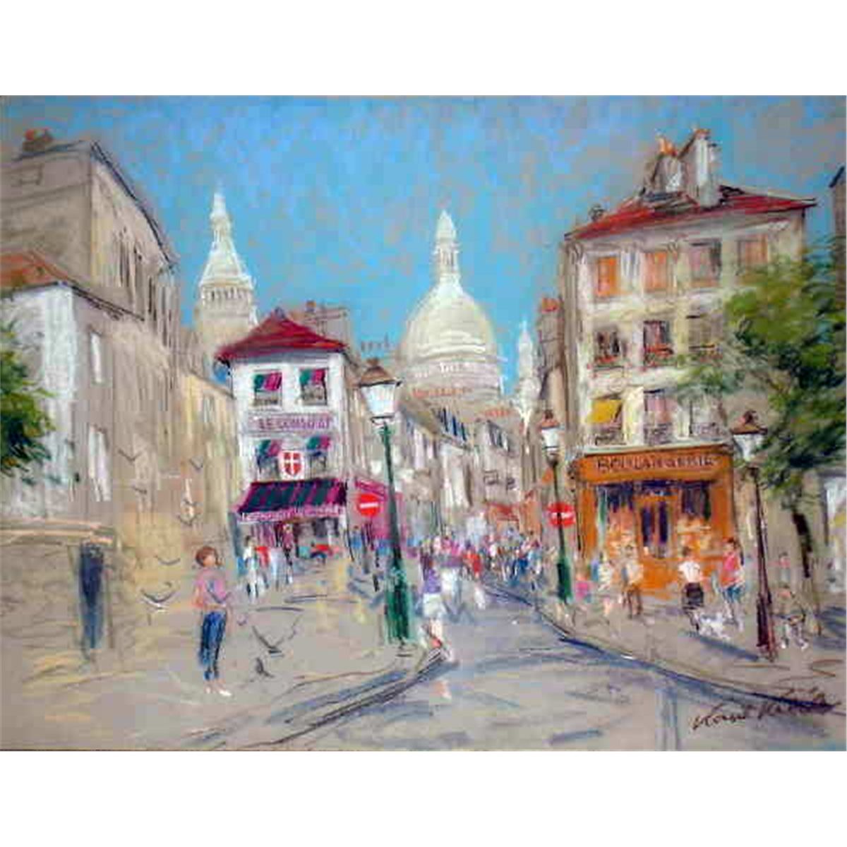 An impressionist landscape of the streets of Paris with Sacre Coeur in the background by the famous American Impressionist who specializes in cityscapes worldwide. 20”x26” pastel on paper, signed by the artist at lower right.. Domestic shipping $125, International depends upon location.