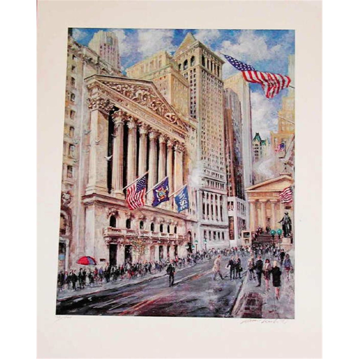 A scene of the Stock Exchange during the noon hour by the well known impressionist cityscape artist. 32”x25” Arches paper, unframed, signed.in pencil Artist’s Proof aside from the edition of 200. A Certificate of Authenticity will accompany this work. Domestic shipping $20, International depends upon location.