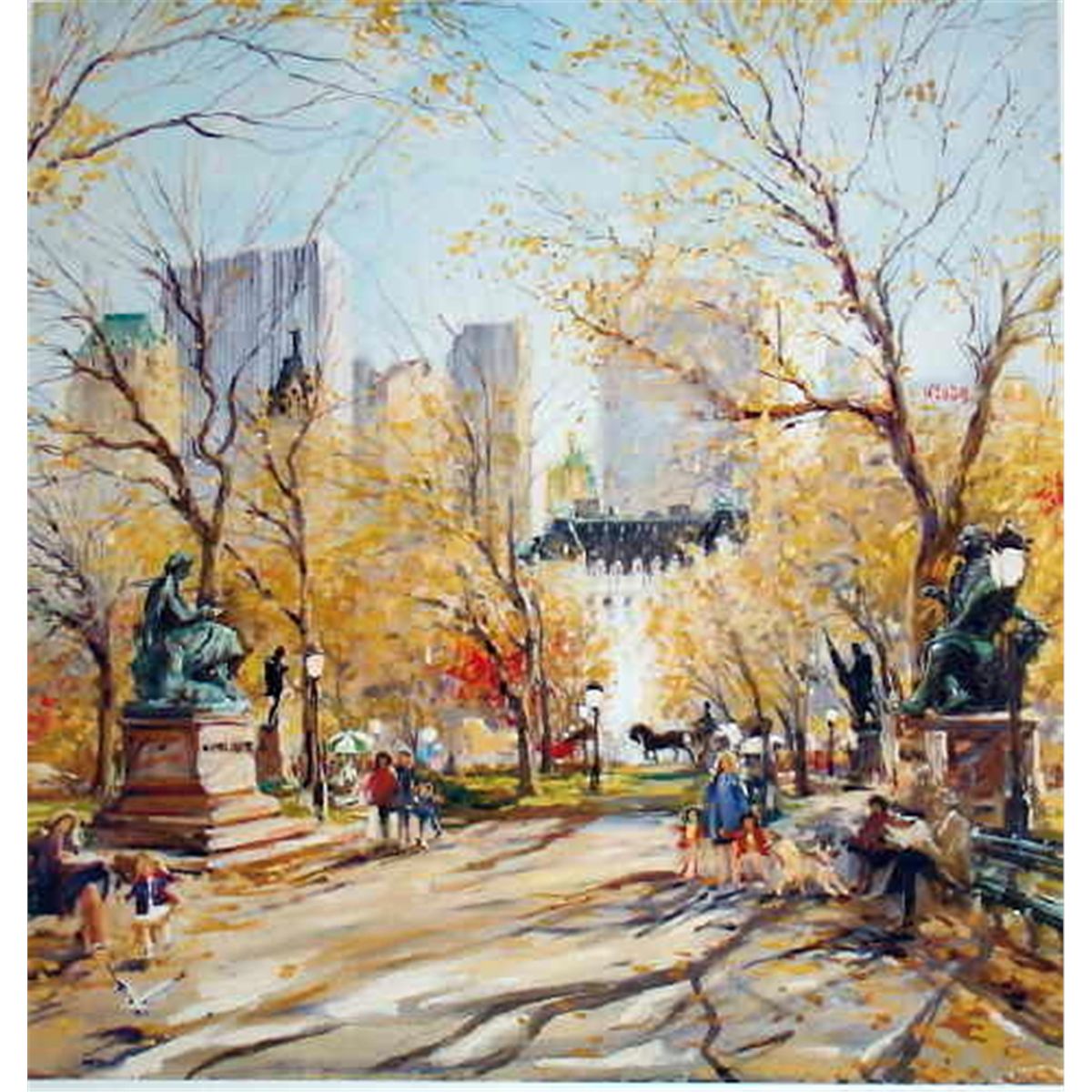 Another beautiful scene of Central Park’s famous Literary Walk, more popularly known as Poets Walk, by the popular impressionist artist who specializes in cityscapes worldwide. Large format 31x29 in. giclee on canvas, signed by the artist in an edition of 99 examples Can be framed without glass like a painting. Domestic shipping-$25, International depending upon location.