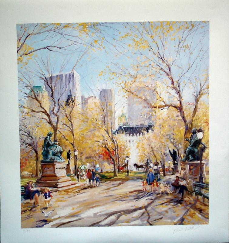 Another beautiful scene of Central Park’s famous Literary Walk, more popularly known as Poet’s Walk, by the popular impressionist artist who specializes in cityscapes worldwide. Large format 32x30 in. giclee on paper, signed by the artist in an edition of 300 examples Domestic shipping-$25, International depending upon location.