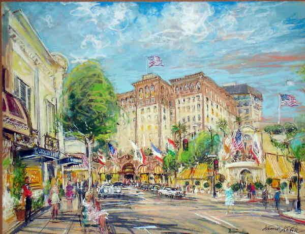 An impressionist view of the famous Beverly Hills shopping area by the well known American Impressionist who specializes in cityscapes worldwide. 20x26 in.pastel on paper, signed by the artist at lower right.. Domestic shipping $125, International depends upon location.