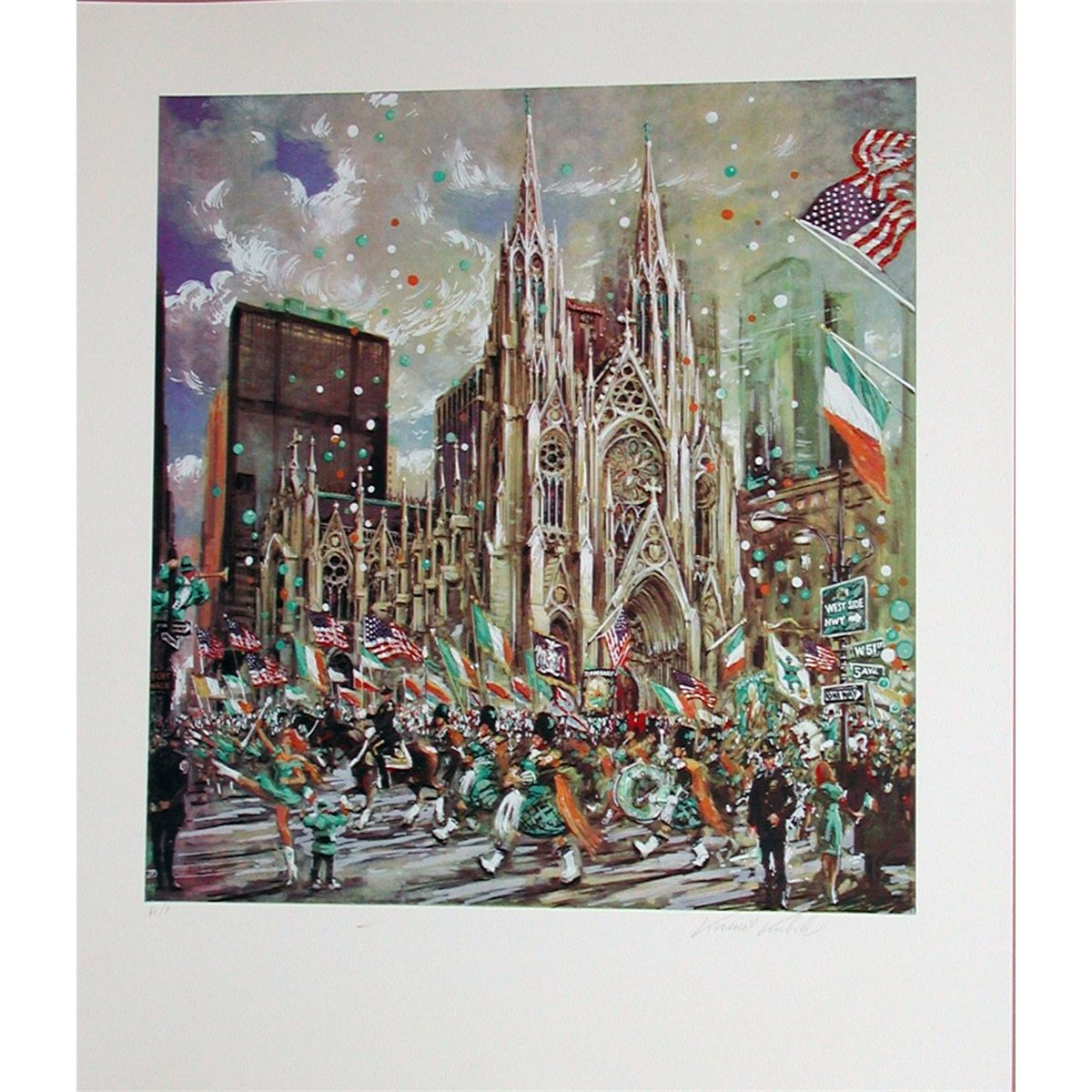 A beautiful scene of the famous cathedral in New York during the St. Patrick’s Day Parade by the popular impressionist artist who specializes in cityscapes worldwide. 33”X28”on paper, unframed, signed in pencil Artist’s Proof aside from the edition of 300. Domestic shipping-$20, International depending upon location.
