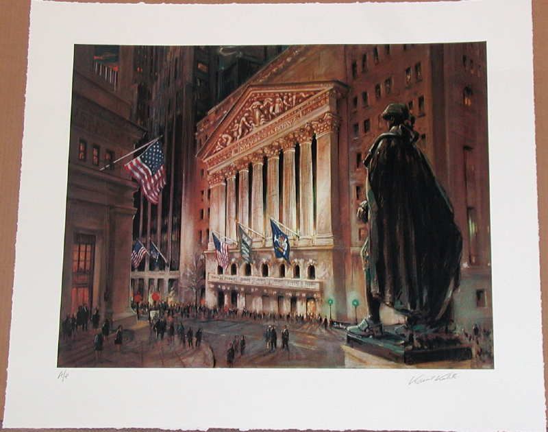 A scene of the Stock Exchange at night by the well known impressionist cityscape artist. 28””x34” serigraph on Rives paper, signed in pencil Artist’s Proof aside from the edition of 185. A Certificate of Authenticity will accompany this work. Domestic shipping $60, International depending upon location.