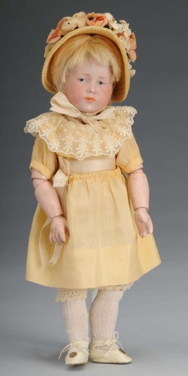 German, circa 1910. Bisque socket head incised K [star] R 101. Painted features, replaced mohair wig. Original fully jointed K & R composition body. Wearing yellow silk dress, straw hat, undergarments and hand-made leather shoes. Large wig pulls. Condition (Excellent). Size 8 - 1/2" T.