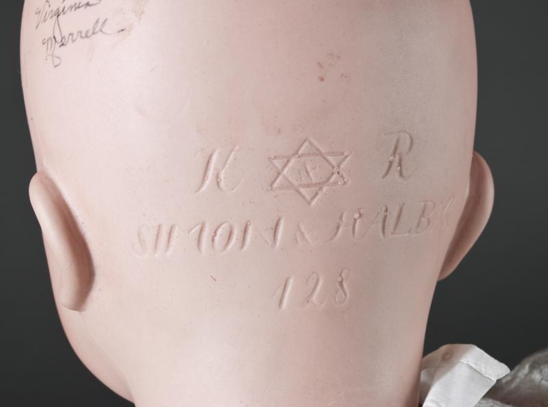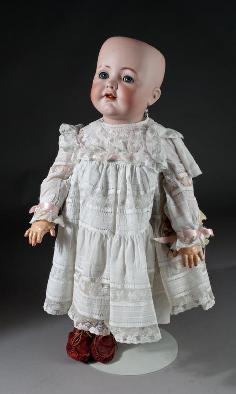 Head marked K*R Simon & Halbig 128. Circa 1909. Jointed body, old nice clothes, probably not original. Blue rocker glass eyes, open mouth and wobble tongue. Head 11" Dia., body size 17" L, doll height 23" L.
