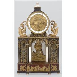Nagyszeben, 19. sz. elso fele, Karl Frisch, 1/4 ütos, rugóra üto szerkezet, mechanikus muködtetésu számlapon Ámor nyilát kovácsolja és köszörüli, mahagóni borítású tokján, apró sérülésekkel, eredeti állapotban, m: 69 cm, tusfestéssel, faragott, aranyozott fa, alabástrom és öntött sárgaréz díszekkel, apró sérülésekkel, eredeti állapotban