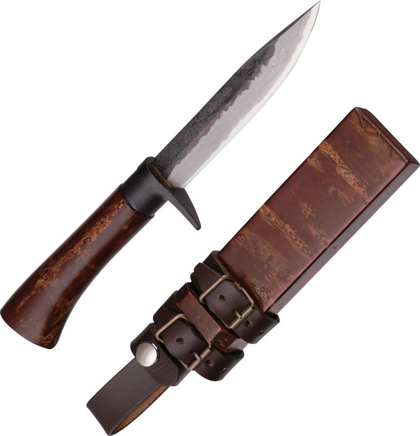 "Kanetsune" Kanetsune Item Number: KB201 SRP: $269.95 9 1/2" overall. 5" 15 layer damascus blue steel blade. Cherry tree skin and oak handle. Wooden sheath. Country of Origin: Japan
