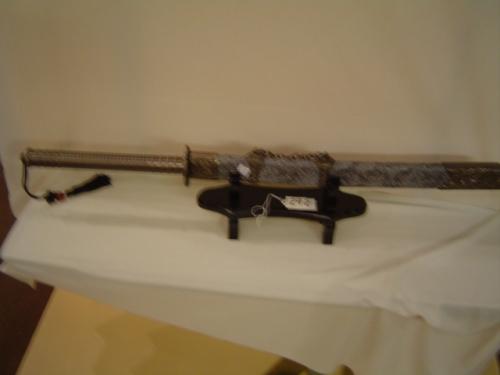 33.75" Kangshi Sword. Pewter Fininsh, Cloth Snakeskin Scabbard, 2219.75" Stainless Steel Tanto Tip Blade, Blood Grove, sharp. Black wood table stand. For Display Use Only.