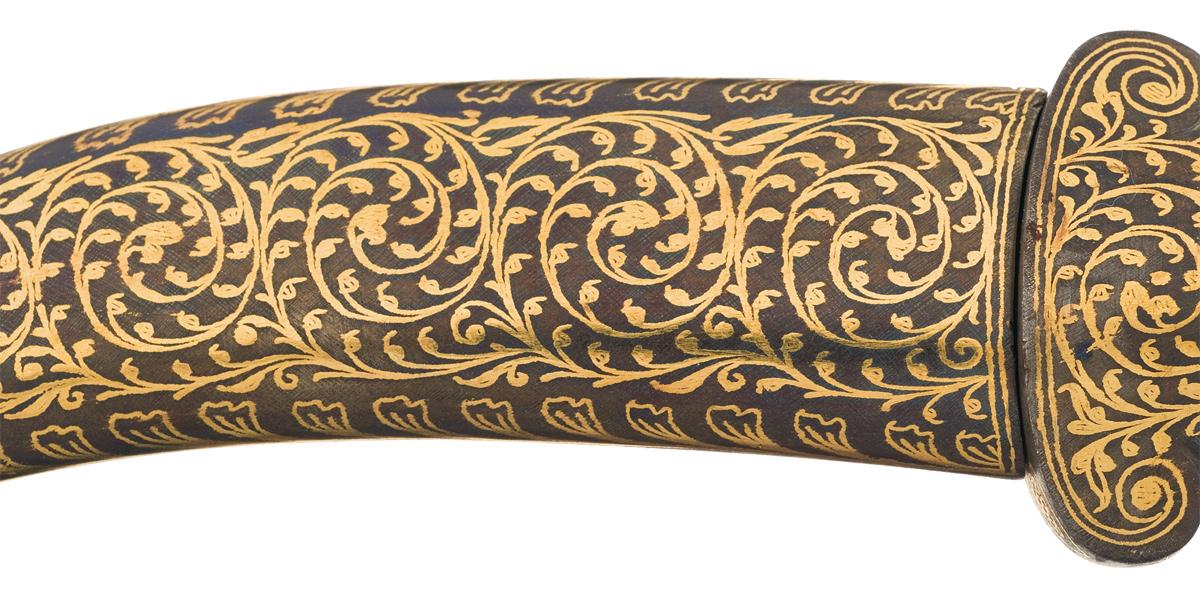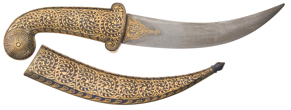 Curved Damascus blade, measuring 6 1/2" long, with triangular floral scroll designs on each side of the ricasso. Iron mameluke pattern hilt, with a red and black filler material on either side of the blade, spiral floral vine inlays down the sides, and a sunburst pattern on the round pommel. Red velvet lined sheath, with similar spiral designs and teardrop patterns at the tip. OAL: 11 1/4"