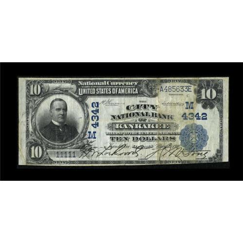 <B>Kankakee, IL</B></I> - $10 1902 Plain Back Fr. 627 <B>The City NB</B></I> Ch. # (M)4342<BR> This note boasts a solid 11111 serial number and solid signatures. There is some wallet staining noted, but is not a significant distraction. <B>Very Fine.</B></I><BR><BR><b>Shipping:</b> Coins & Currency (<a target="_blank" href="http://www.heritageauctions.com/common/shipping.php">view shipping information</a>)
