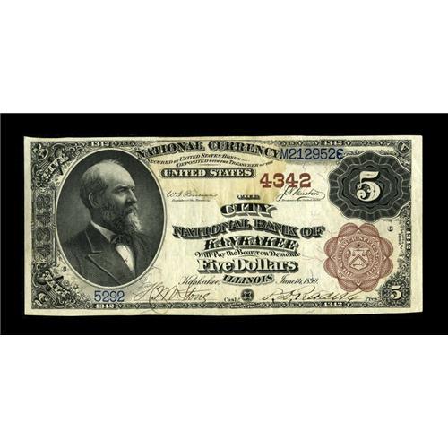 <B>Kankakee, IL</B></I> - $5 1882 Brown Back Fr. 471 <B>The City NB</B></I> Ch. # 4342<BR>Lovely pen signatures grace the surface of this pleasing example from this locale south of Chicago. Crisp, well inked surfaces give way to a slight stain at top center along with a few pinholes. Almost 30 years have passed since this denomination has been available at public auction. <B>Extremely Fine.</B></I><BR><BR><b>Shipping:</b> Coins & Currency (<a target="_blank" href="http://www.heritageauctions.com/common/shipping.php">view shipping information</a>)