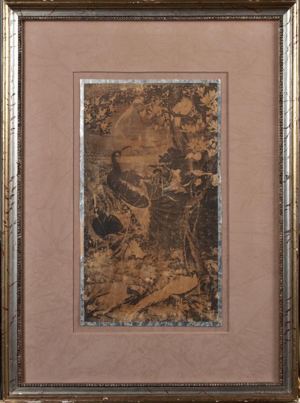Depicting peacock and flowers. The original painting was done in the 17th century and was reproduced by woodblock print in the 1800's. Nicely framed and matted. Image 14.375" H x 8.25" W, circa late 19th century.