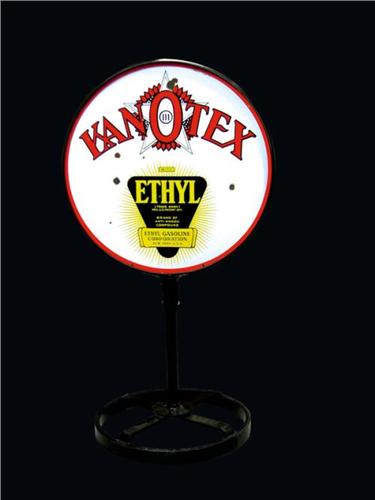 Kanotex Porcelain Sign, gas station driveway sign. 2 sided, base marked with mfg. name. A couple of Quarter size chips otherwise very good condition. 30 inches dia.