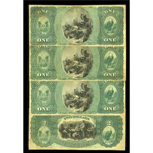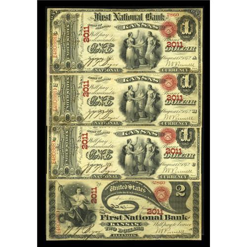 <B>Kansas, IL</B></I> - $1-$1-$1-$2 Original Fr. 382/389 <B>The First NB</B></I> Ch. # 2011<BR> This cut sheet bears serial number 2860 on all four pieces. A small hoard of Original Series Aces and Deuces produced a number of very nice, colorful pieces. Each of the pieces here is near uncirculated with a fold or two noted on each piece and some light handling. Each piece shows some restoration in the corners, though the overall eye appeal is solid. <B>Extremely Fine to About Uncirculated.</B></I><BR><BR><b>Shipping:</b> Coins & Currency (<a target="_blank" href="http://www.heritageauctions.com/common/shipping.php">view shipping information</a>)