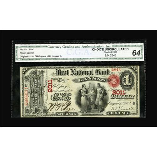 <B>Kansas, IL</B></I> - $1 Original Fr. 382 <B>The First NB</B></I> Ch. # 2011<BR> A lovely First Charter ace with as bright a red overprint as we've ever seen. <B>CGA Choice Uncirculated 64</B></I> and a perfect example for any high end type set. <BR><BR><b>Shipping:</b> Coins & Currency (<a target="_blank" href="http://www.heritageauctions.com/common/shipping.php">view shipping information</a>)