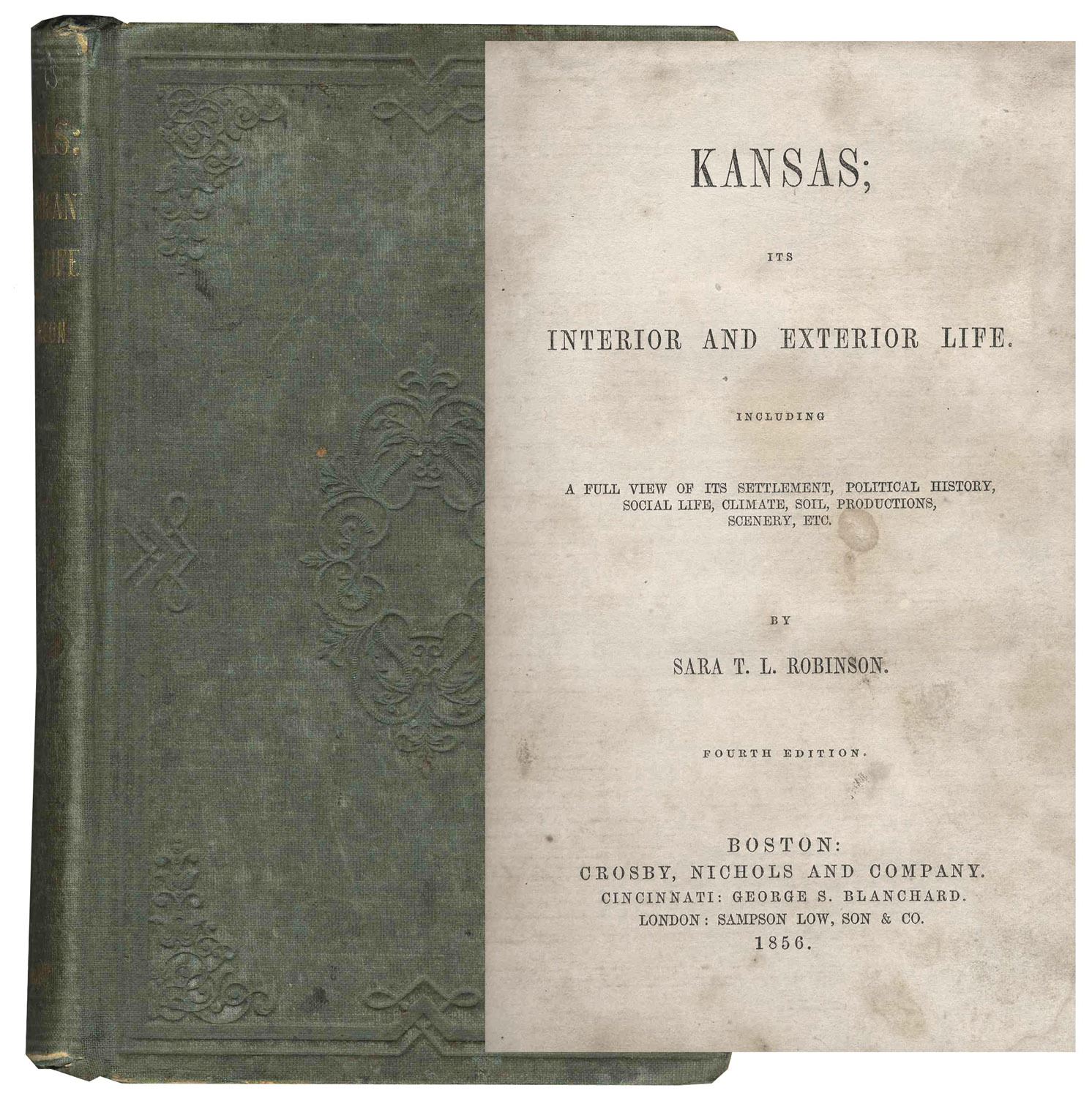 ''Kansas; Its Interior and Exterior Life. Including a Full View of its Settlement, Political History, Social Life, Climate, Soil, Productions, Scenery, Etc.'' by Sara T.L. Robinson. Boston: Crosby, Nichols and Company: 1856. Book has wear to boards and backstrip. Backstrip broken in two places, otherwise binding is tight. Previous owner's pencil to front flyleaf. Scattered foxing throughout. Overall good condition.