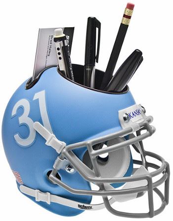 Schutt Sports NCAA Licensed Helmet Desk Caddy in the TB Blue Matte Kansas Jayhawks logo. Perfect for the home or work office, this attention-grabbing desk ornament leaves no doubt to guests and business acquaintances who's your team. Fill it with business cards and team-colored pens, but be prepared to talk Jayhawks football when people roll in.