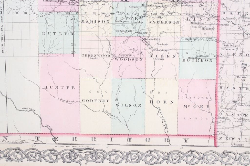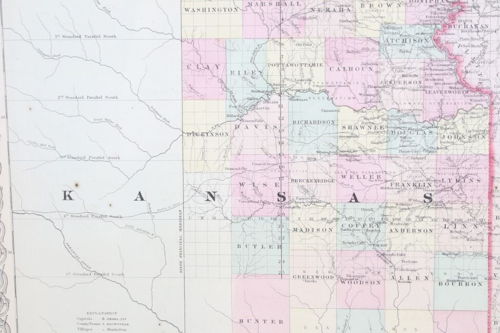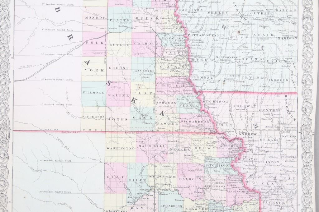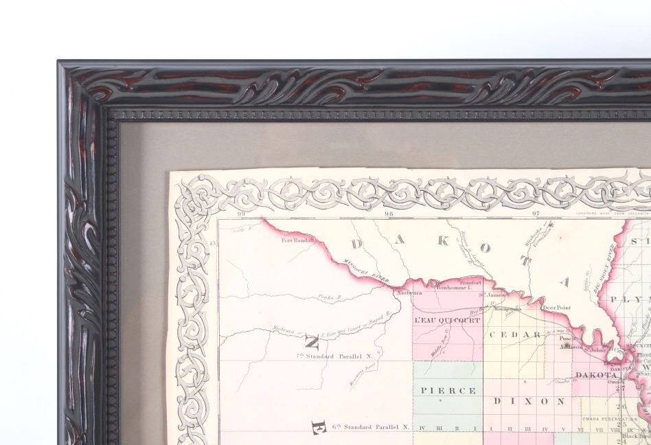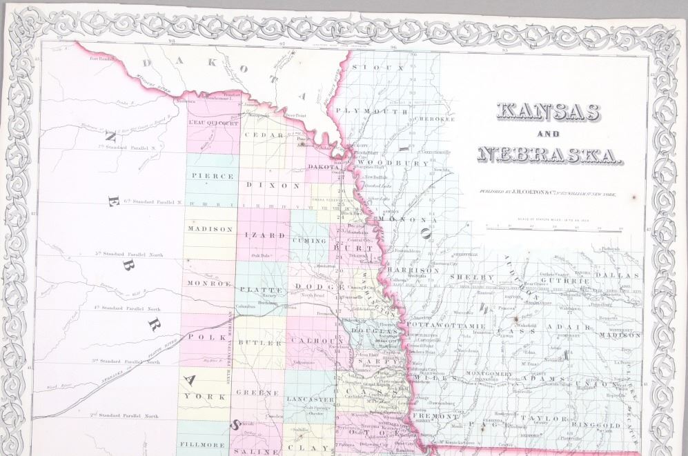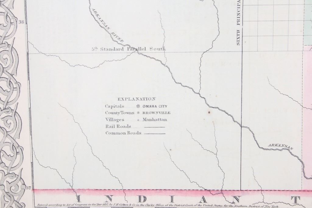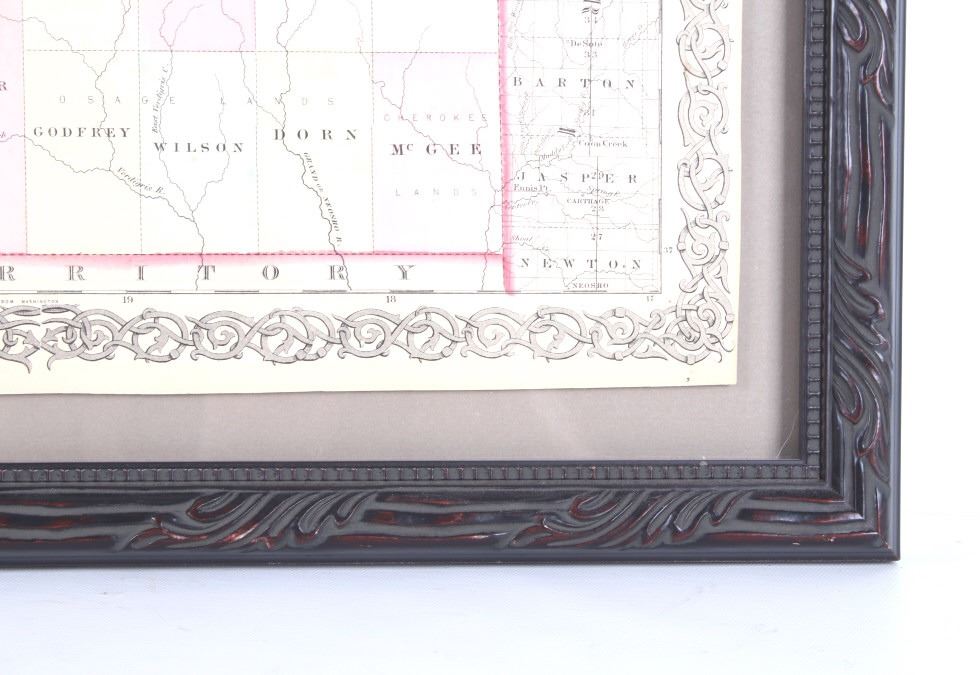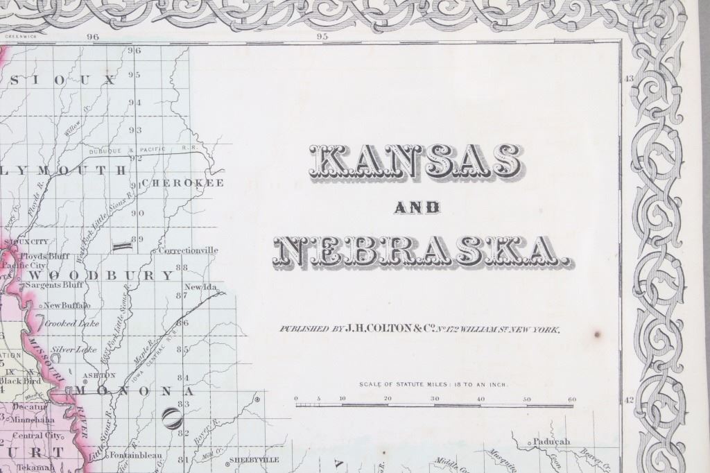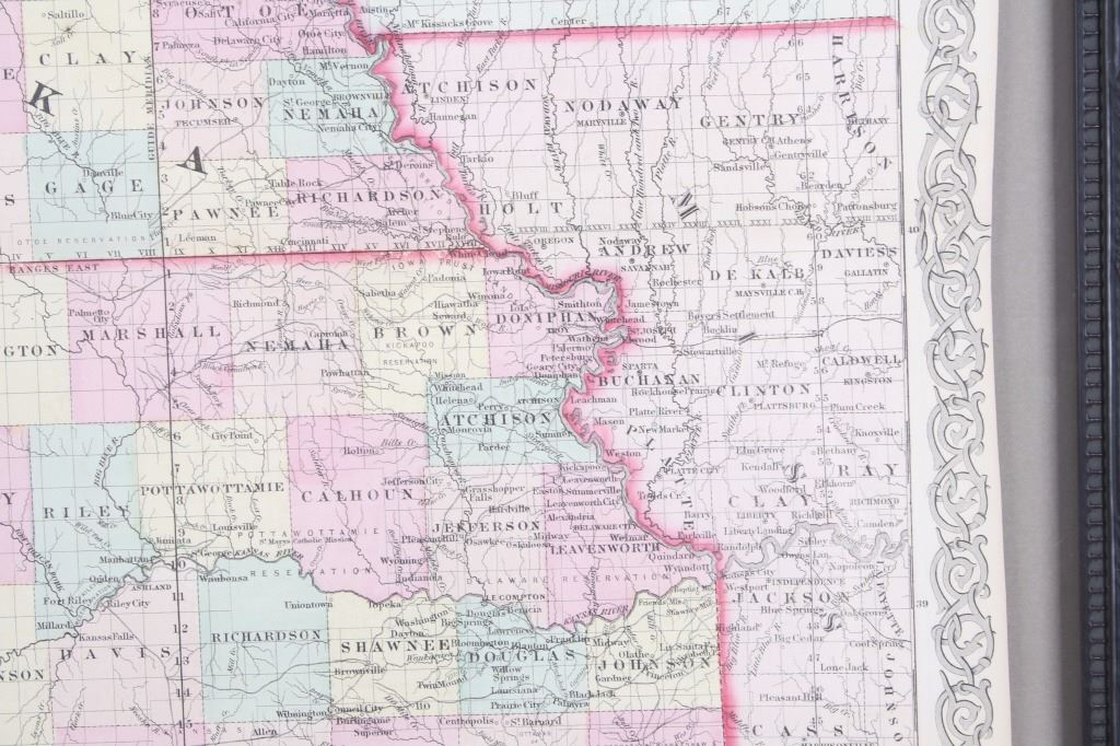Featured in this lot is this Kansas and Nebraska framed territorial map circa 1857. The territorial map features a wonderfully and professionally crafted map that shows the state of Kansas and Nebraska with counties correctly stated and shows the state lines of both states. The fine print in the bottom left hand corner states that it was entered into the Library of Congress in 1857 and was published by J.H. Colton & Co. The condition of this Territorial Map is good with no obvious signs of damage and shows good overall condition. The measurements of this framed Territorial Map is 29 7/8" x 20 7/8" and the visible map measures 26" x 16 3/4". Provenance: From the renowned Sundog Fine Art Bozeman, Montana collection and collected by Bruce VanLandingham. Bruce VanLandingham was a pillar in the American Indian collecting community and a respected expert. Along with being an avid collector, Bruce also was the sole owner of Sundog Fine Art Gallery in Bozeman, which was both part museum and gallery.