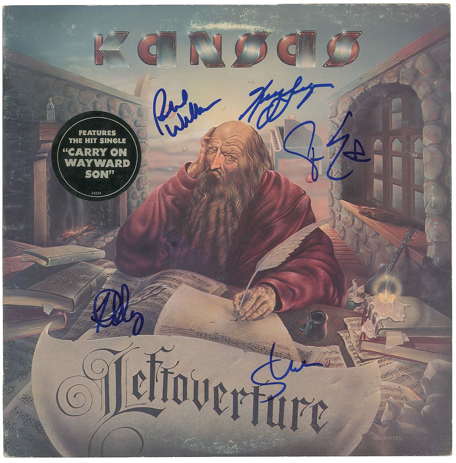 Leftoverture album signed on the front cover in blue felt tip by Steve Walsh, Kerry Livgren, Robby Steinhardt, Rich Williams, and Phil Ehart. In fine condition, with light scuffing. The record is included.