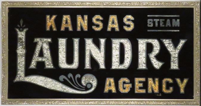 Kansas Steam Laundry Agency Reverse Glass Glue Chip Process Sign. Excellent condition. 25 X 13 inches.