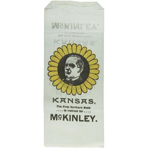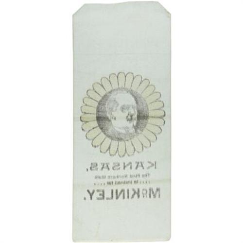 <B>Kansas for McKinley Sunflower Ribbon.</B></I> At 3 1/8" x 7 5/8" this is a very impressive McKinley Campaign ribbon from Kansas. It is in extremely fine condition. This ribbon is notable in that when it was manufactured, it must have been laid against another freshly run ribbon with wet ink, as there is reversed ghost imaging at the top. In our opinion, this does little to detract from this seldom seen ribbon from the turn of the century.<BR><BR><b>Shipping:</b> Miscellaneous Collectibles, Smal (<a target="_blank" href="http://www.heritageauctions.com/common/shipping.php">view shipping information</a>)