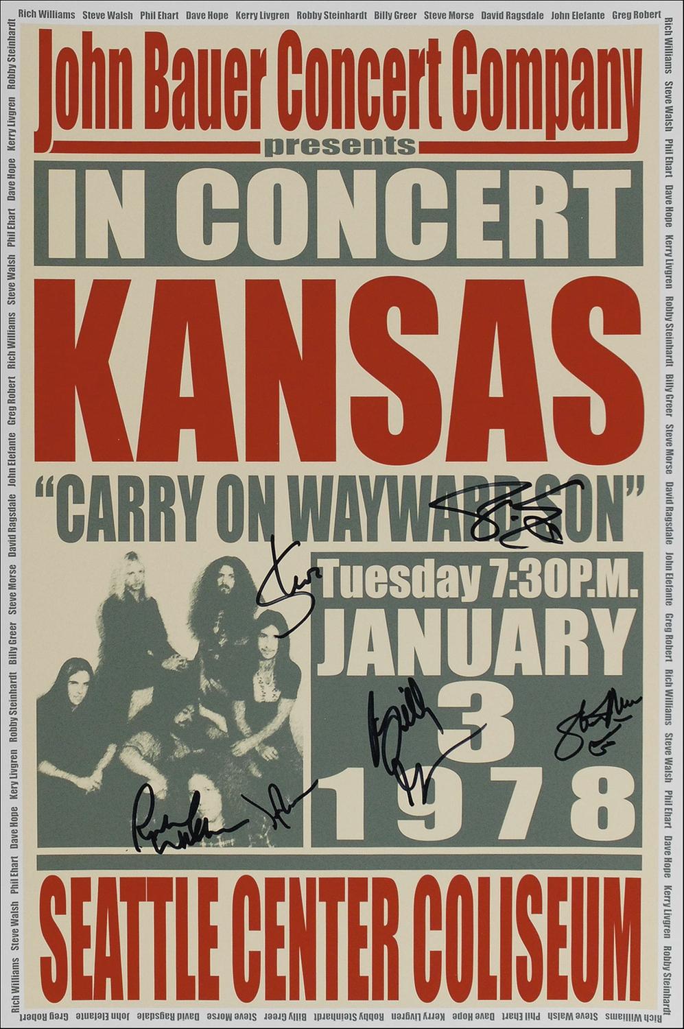 Color glossy 12 x 18 photo of a poster for a Kansas concert at the Seatle Center Coliseum on January 3, 1978, signed in black felt tip by Steve Walsh, Phil Ehart, Rich Williams, Billy Greer, Steve Morse, and David Ragsdale. In fine condition.