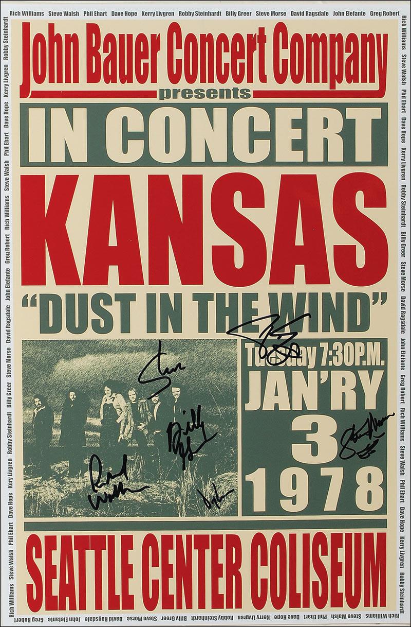 Color glossy 12 x 18 photo of a poster for a Kansas concert at the Seattle Center Coliseum on January 3, 1978, signed in black felt tip by Steve [Walsh], Phil Ehart, Rich Williams, Billy Greer, David [Ragsdale], and Steve Morse, the latter adding a drawing of a guitar below his signature. In very fine condition.