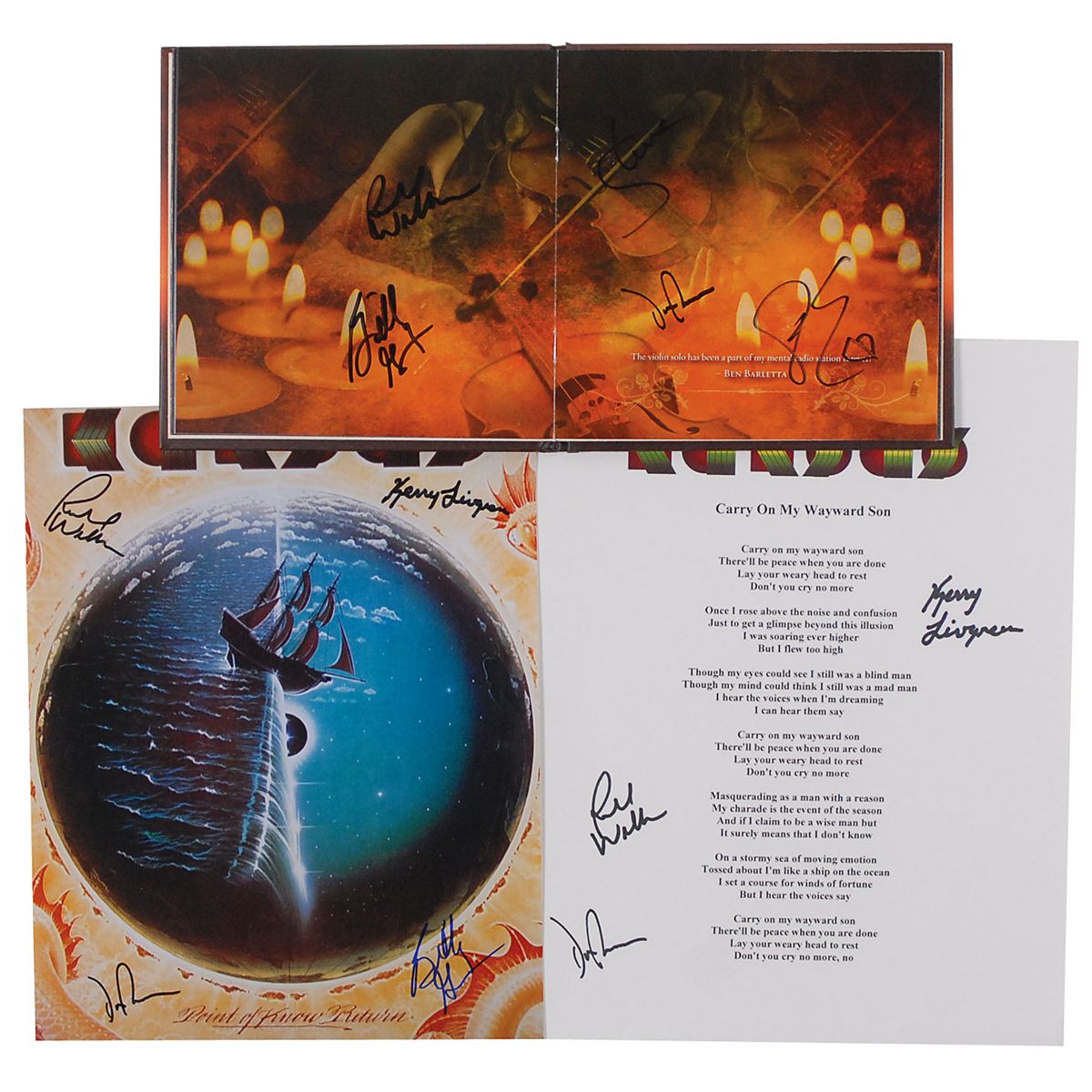 Three items: hardcover copy of Dust in the Wind: 35th Anniversary, signed in the gatefold by Phil Ehart, Steve Walsh, Richard Williams, Billy Greer, and Dave Ragsdale; printed souvenir lyrics signed by Kerry Livgren, Williams, and Ragsdale; and a photo signed by Livgren, Williams, Greer, and Ragsdale. In fine condition.