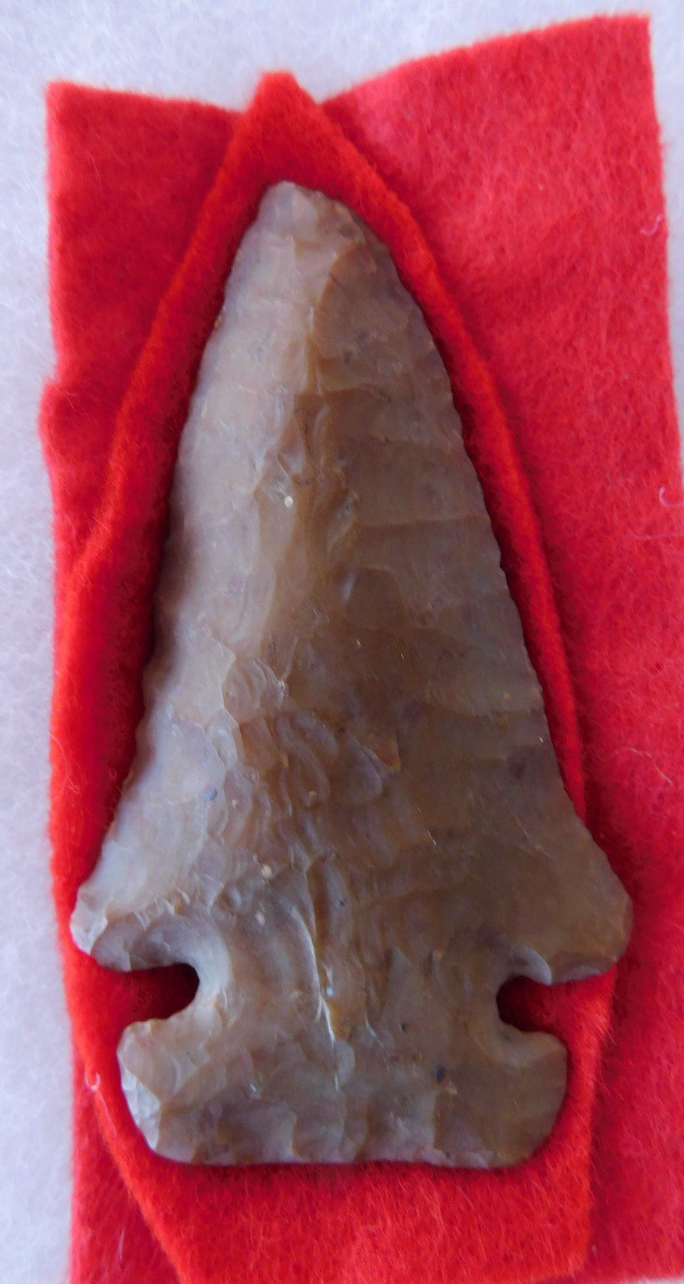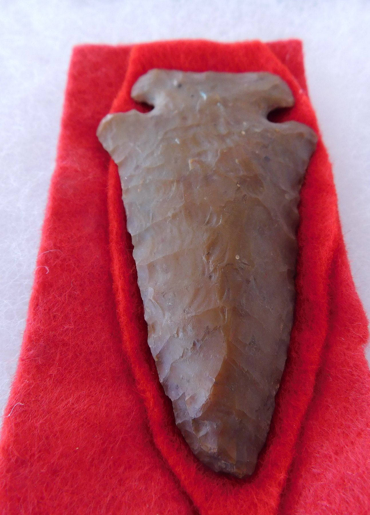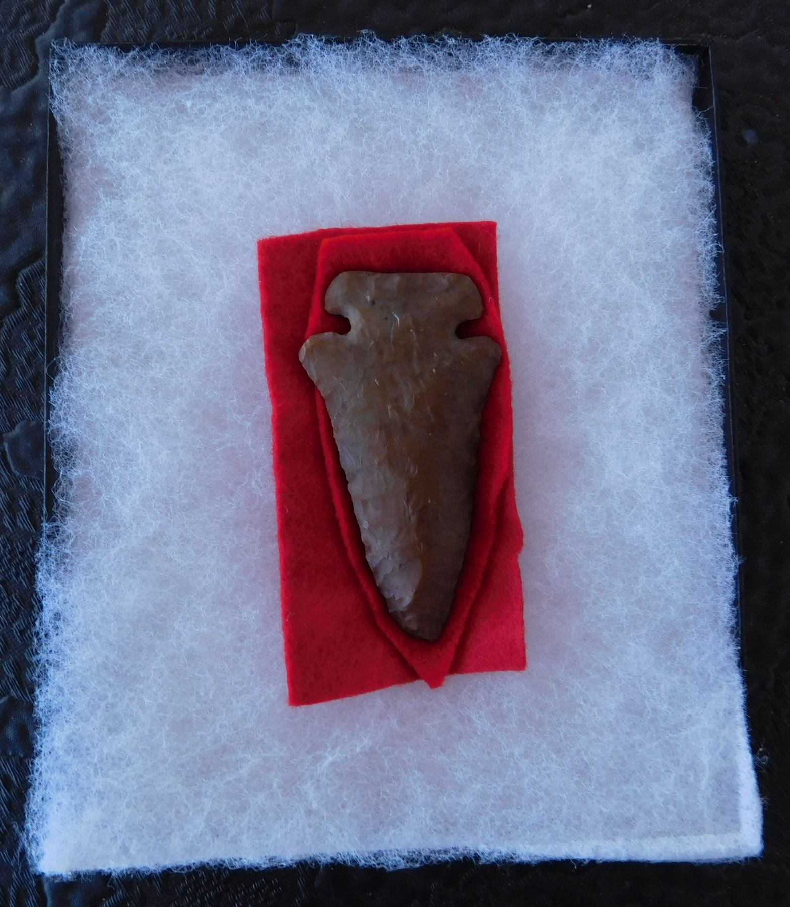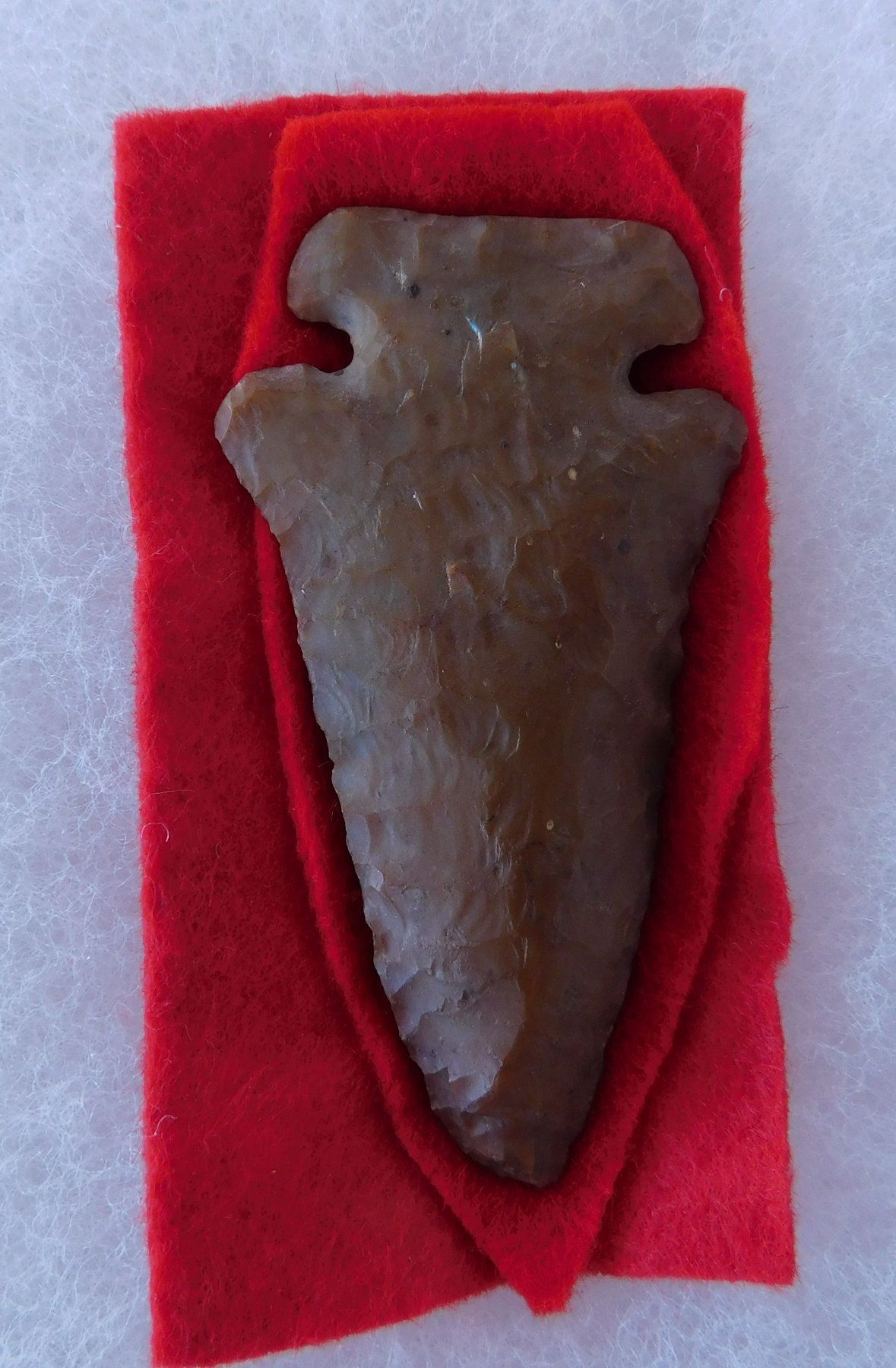 Kaolin Dovetail Point w/Helm COA, pre-historic item. Made of kaolin flint, the item measures 2 3/4". Adams County, Illinois. Helm Certificate of Authenticity. Frame not included. Condition: Good, see images. Shipping: $14.50 w/insurance and signature.