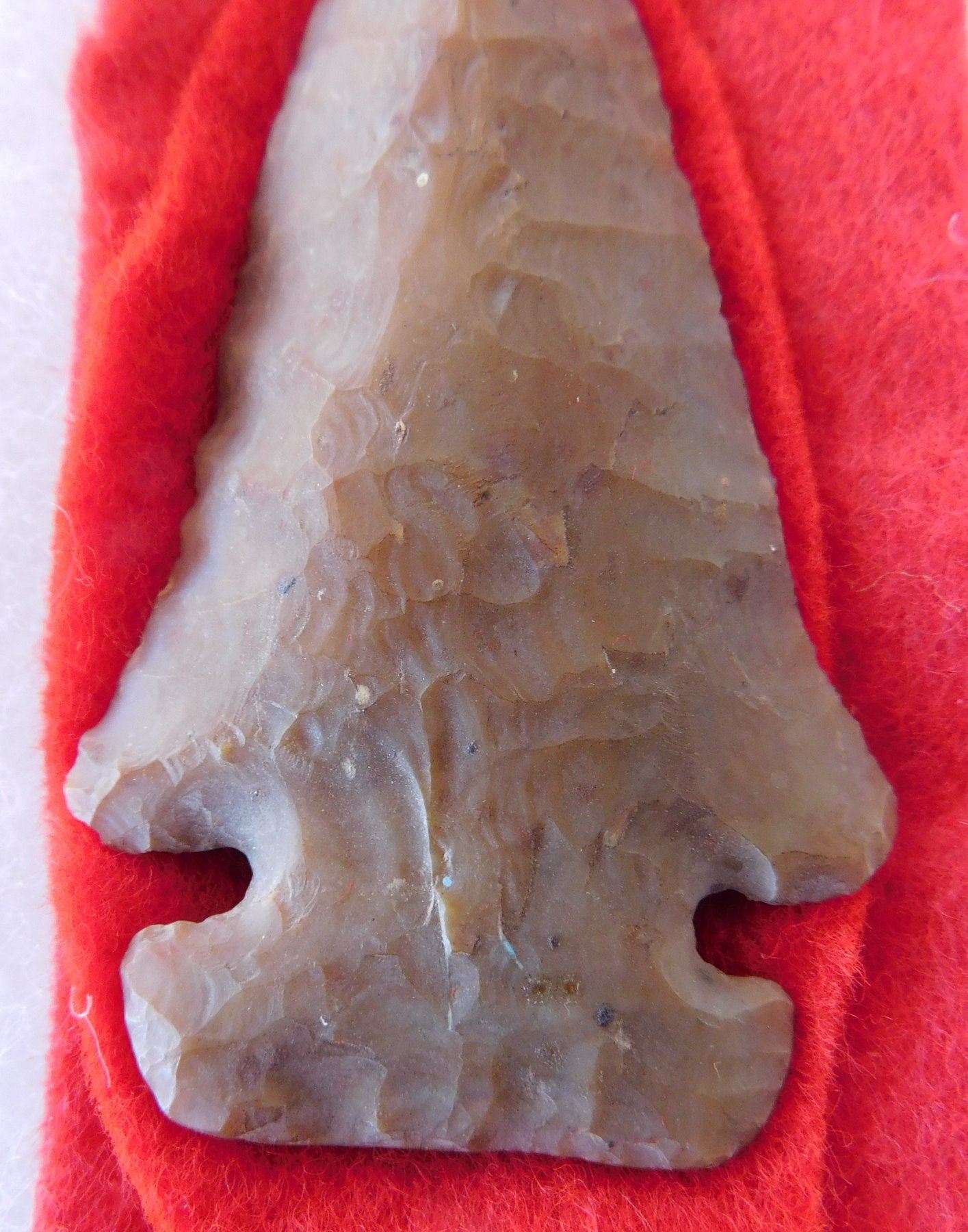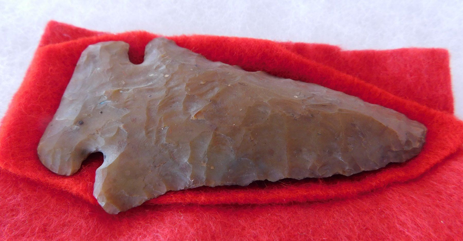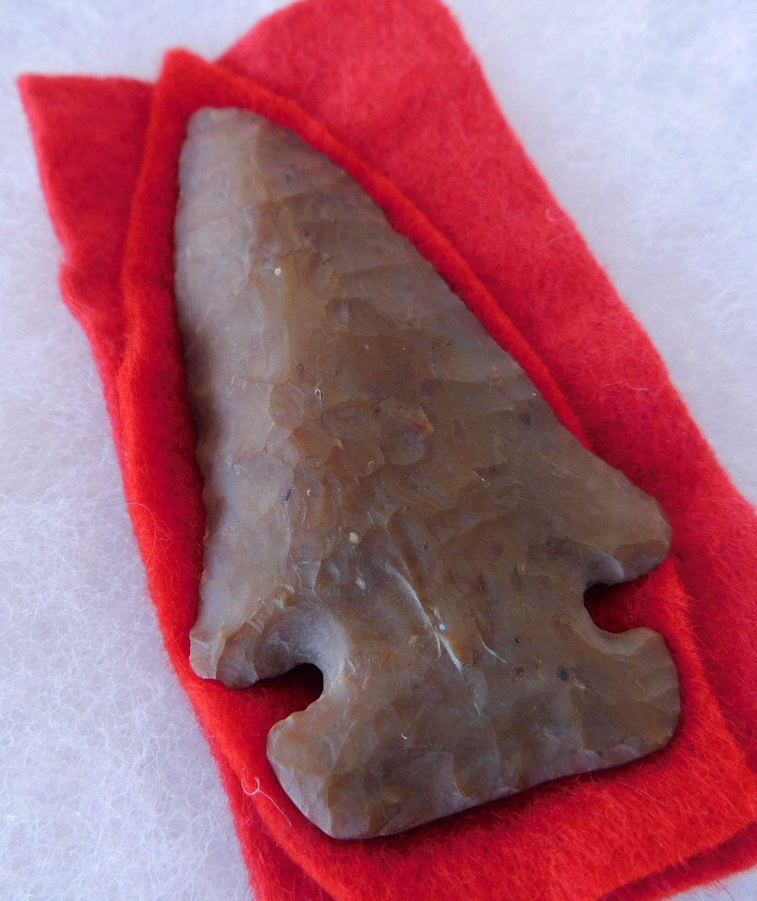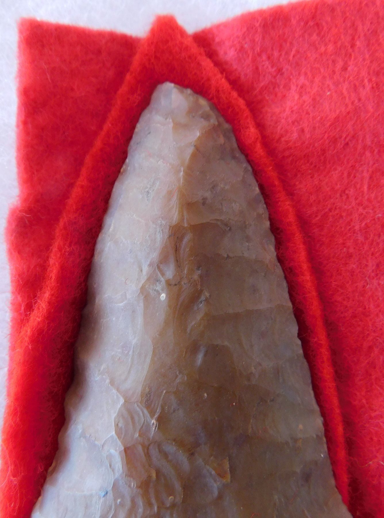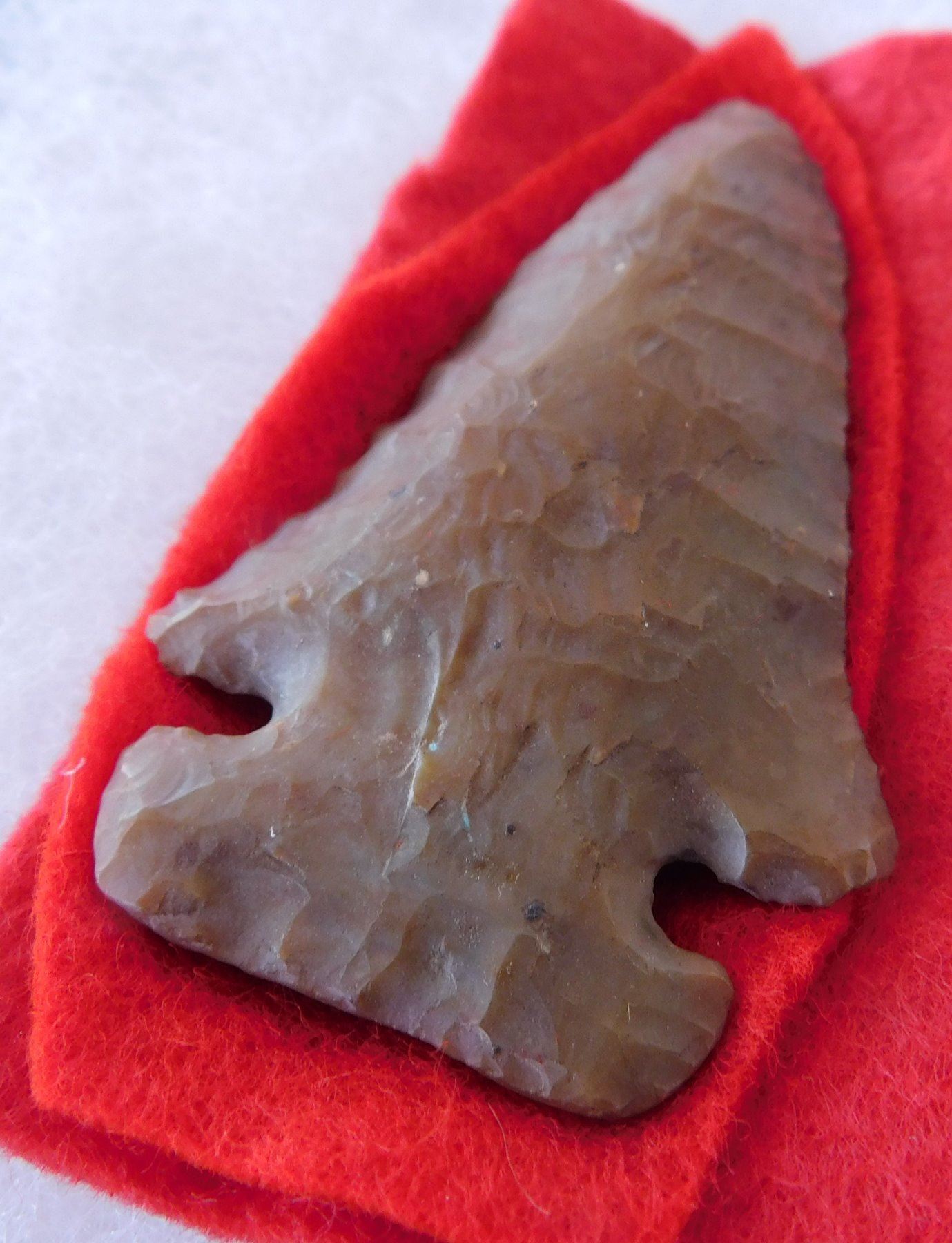 Kaolin Dovetail Point w/Helm COA, pre-historic item. Made of kaolin flint, the item measures 2 3/4". Adams County, Illinois. Helm Certificate of Authenticity. Frame not included. Condition: Good, see images. Shipping: $14.50 w/insurance and signature.