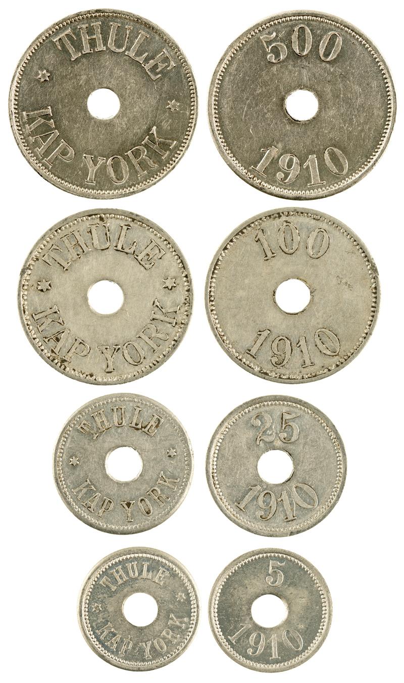 Four tokens: Obverse: Thule / Kap York; Reverse: 5, 25, 100,500 / 1910. About uncirculated. This token can be attributed to the Thule-Cape York Trading Co. in Greenland founded by Knud Rasmussen in 1910. They are typically attributed to Greenland or Denmark, although it would be considered a trading post.