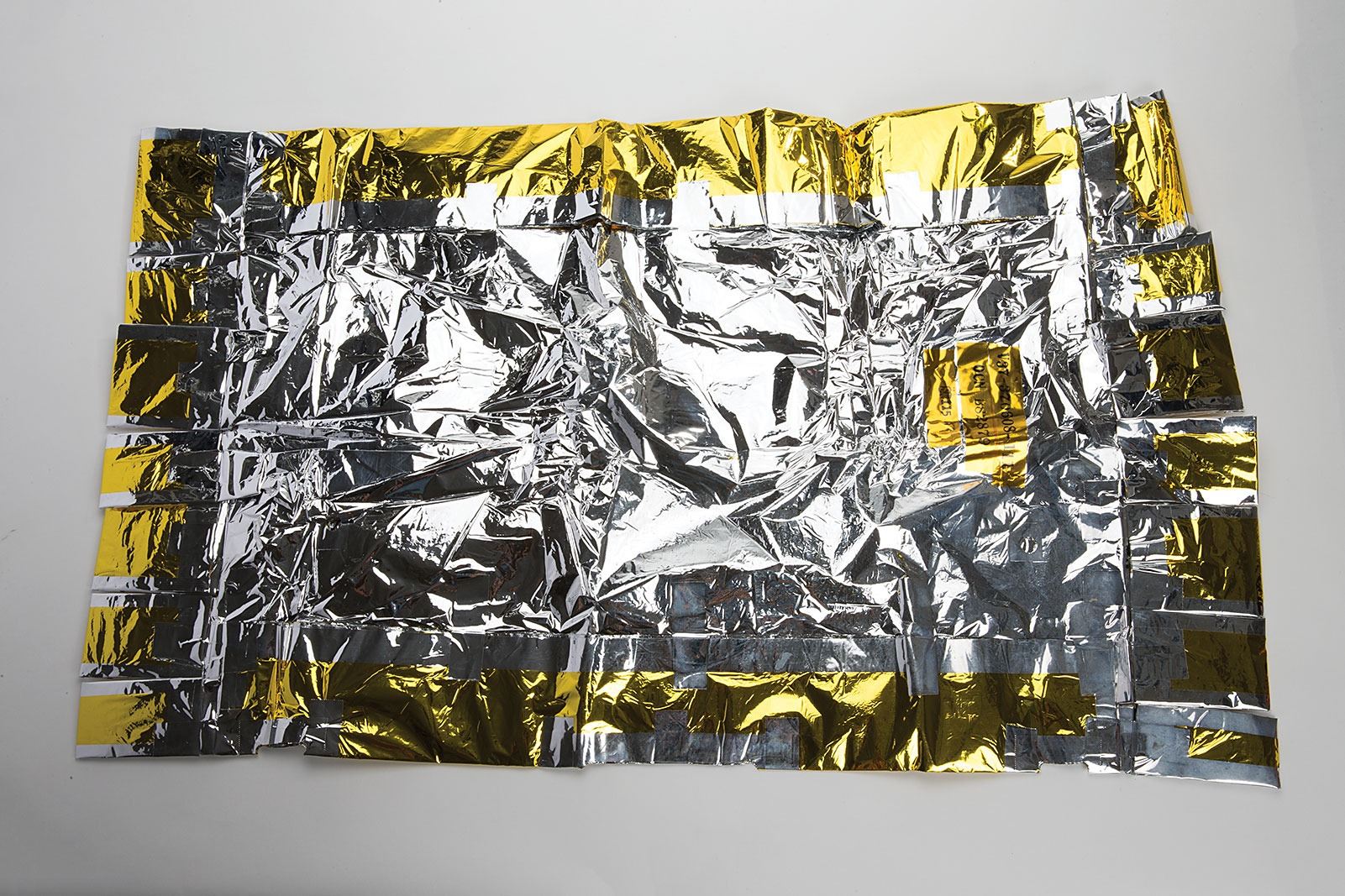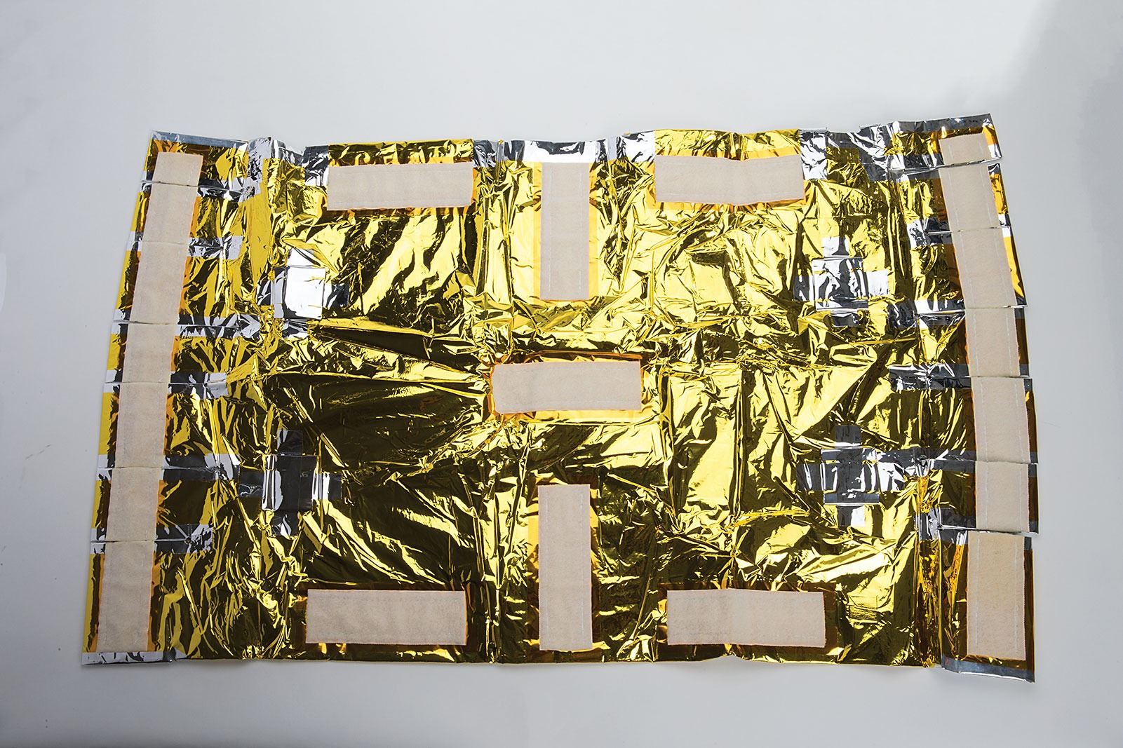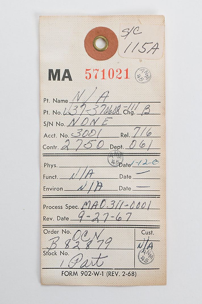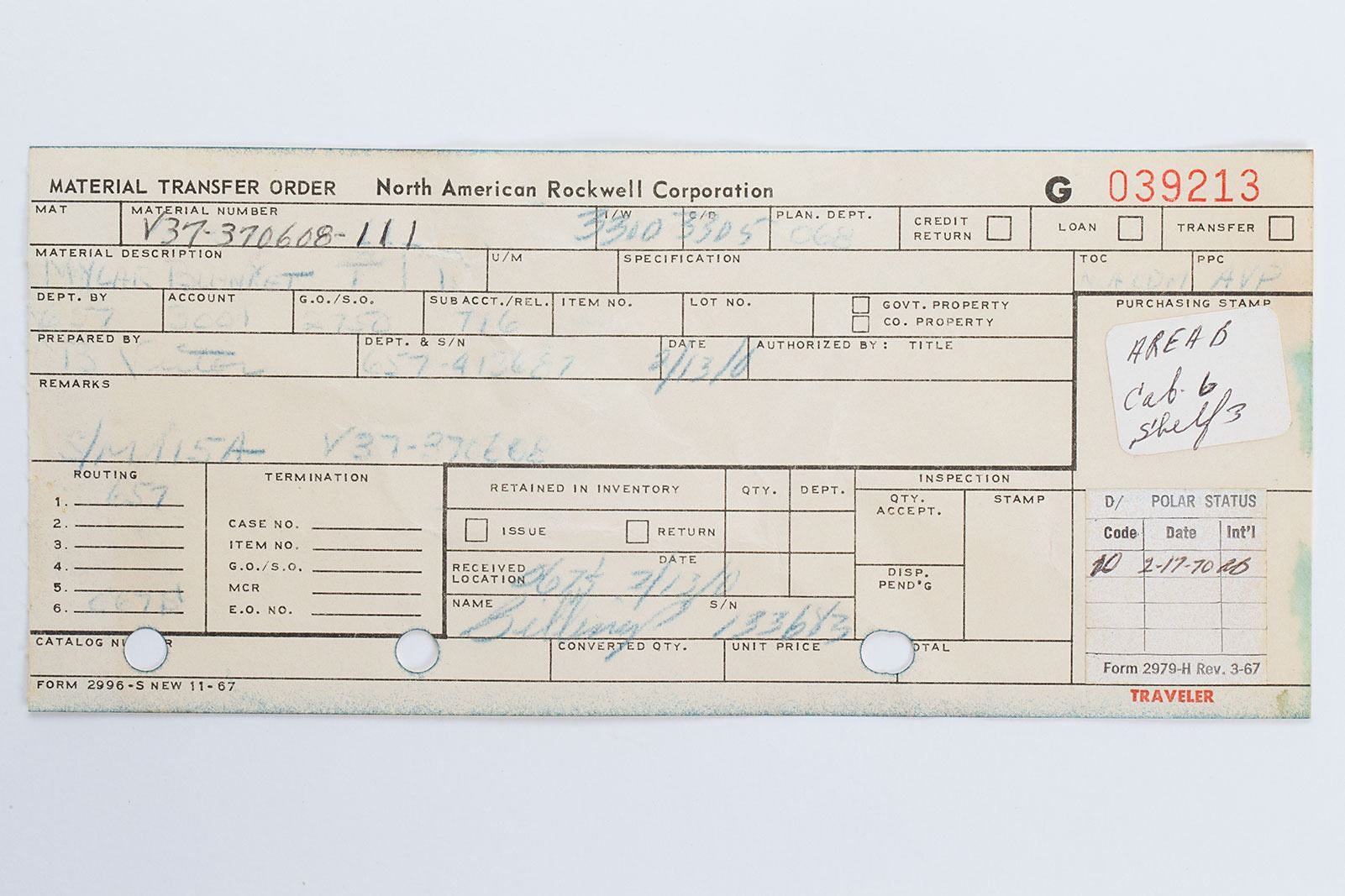 Kapton Thermal Blanket for the interior of the Apollo Service Module, measuring 21? x 35?, marked on the silver side with part numbers: "V37-370608-111, OCN B82879, SN 115." Numerous white Velcro swatches have been applied to the gold side for securing it within the Service Module. In fine condition. Accompanied by an associated parts tag and a North American Rockwell material transfer order.