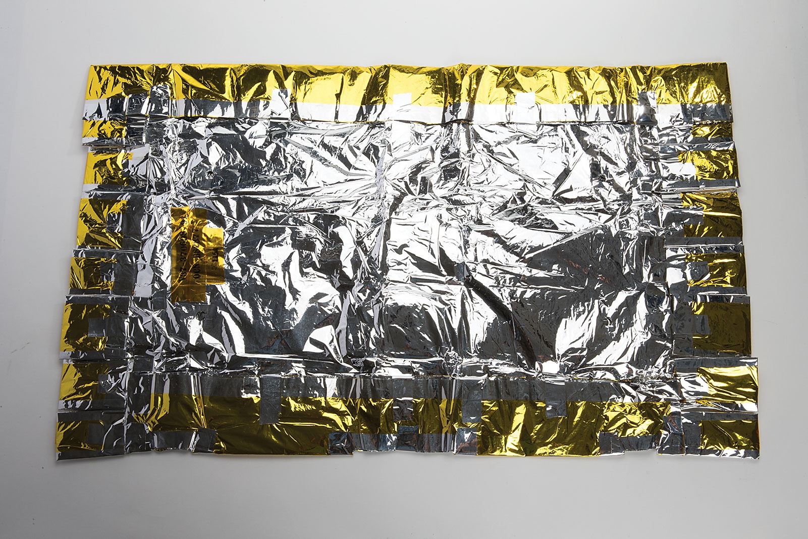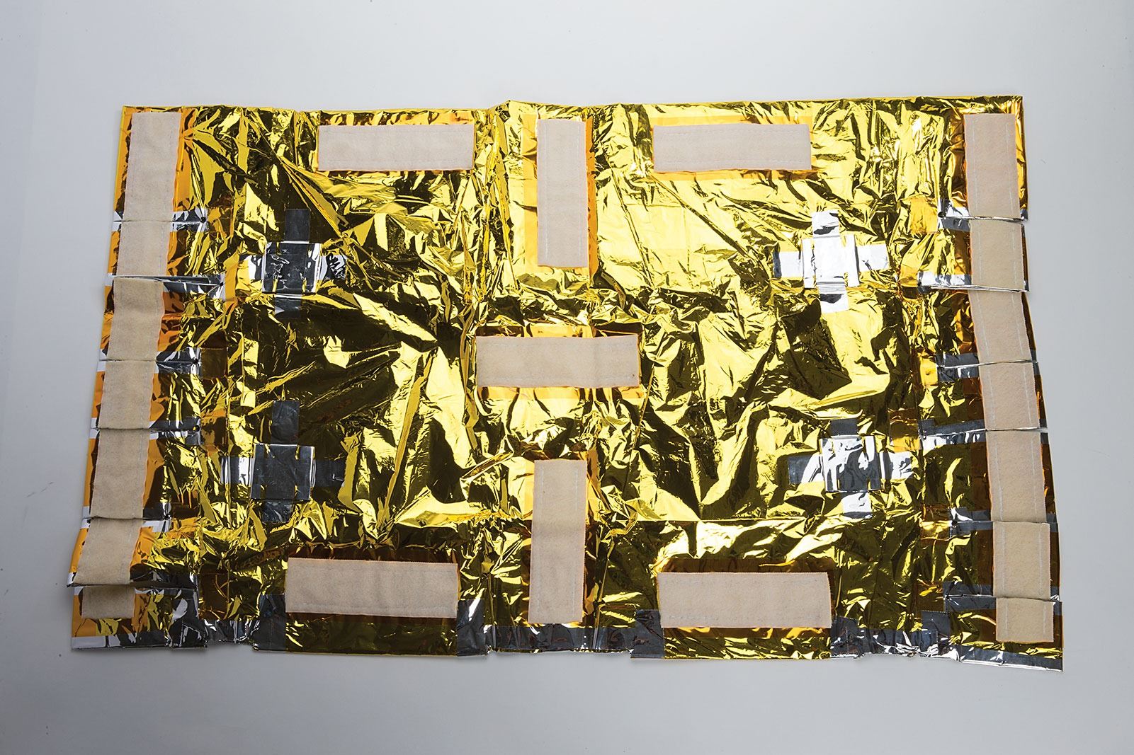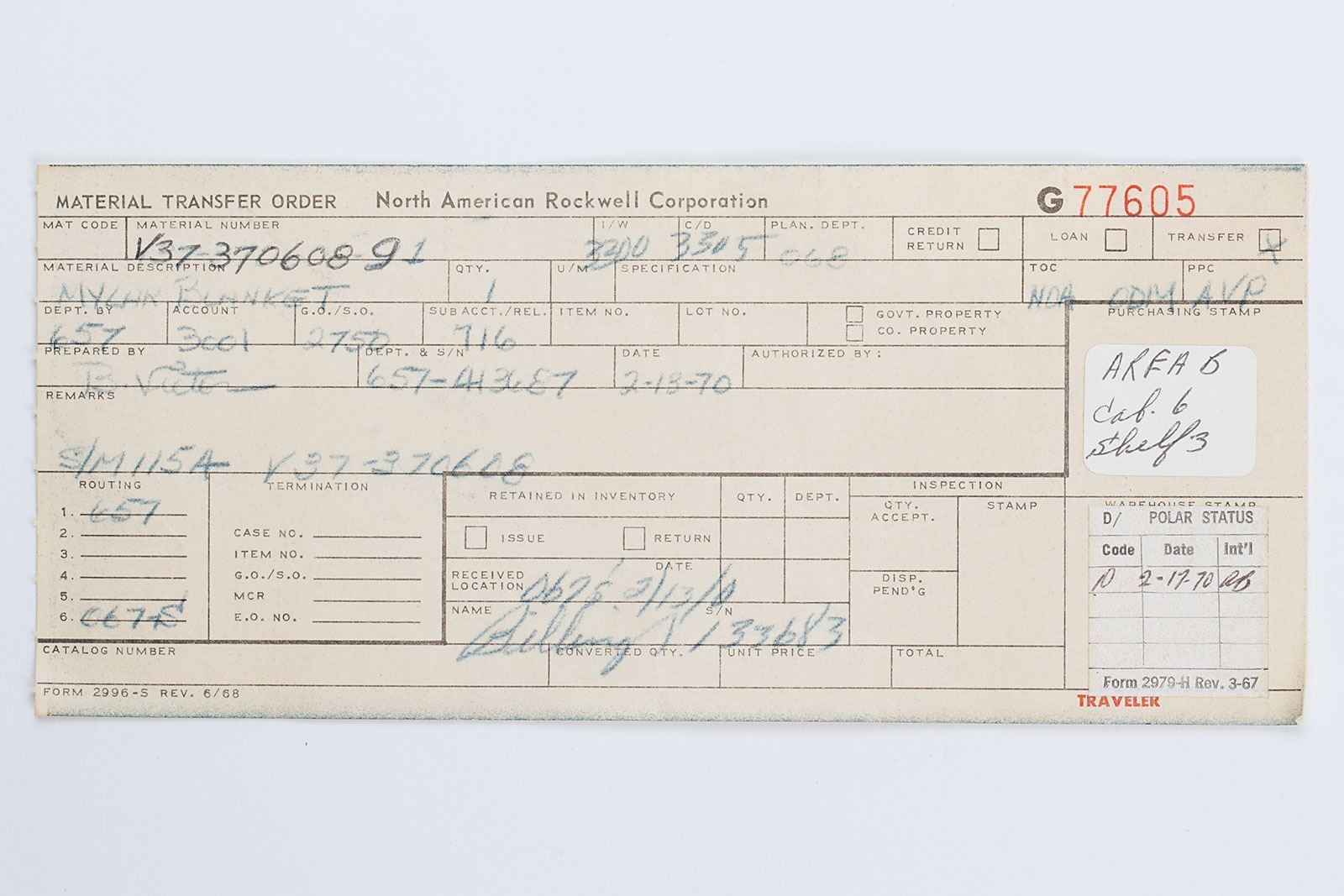 Kapton Thermal Blanket for the interior of the Apollo Service Module, measuring 21.5? x 36?, marked on the silver side with part numbers: "V37-370608-91, OCN B82877, SN 1154." Numerous white Velcro swatches have been applied to the gold side for securing it within the Service Module. In fine condition. Accompanied by a North American Rockwell material transfer order.