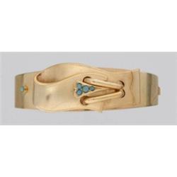 Pest, 19. sz. utolsó harmada, 14 k arany, szalagdíszes rátéten 5 db türkizzel, nyelves záródással, 17,1 g